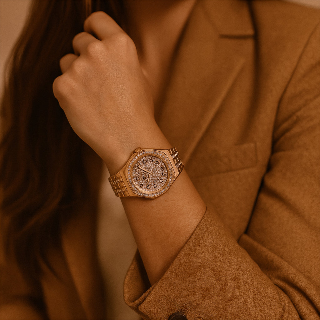 Le cadran en or rose est également serti de cristaux et présente des chiffres arabes en relief noirs. Les aiguilles en or rose avec des incrustations luminescentes blanches assurent une bonne lisibilité. Le design luxueux est complété par un bracelet massif en acier inoxydable avec revêtement IP or rose et sertissage partiel de cristaux.