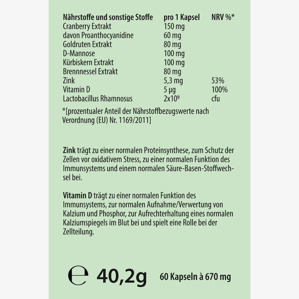 L' extrait de canneberge inclus, contenant 40 mg de proanthocyanidines (PAC), est traditionnellement utilisé pour la santé de la vessie et des voies urinaires. Le D-mannose , un sucre souvent présent dans les régimes alimentaires, complète la formule.