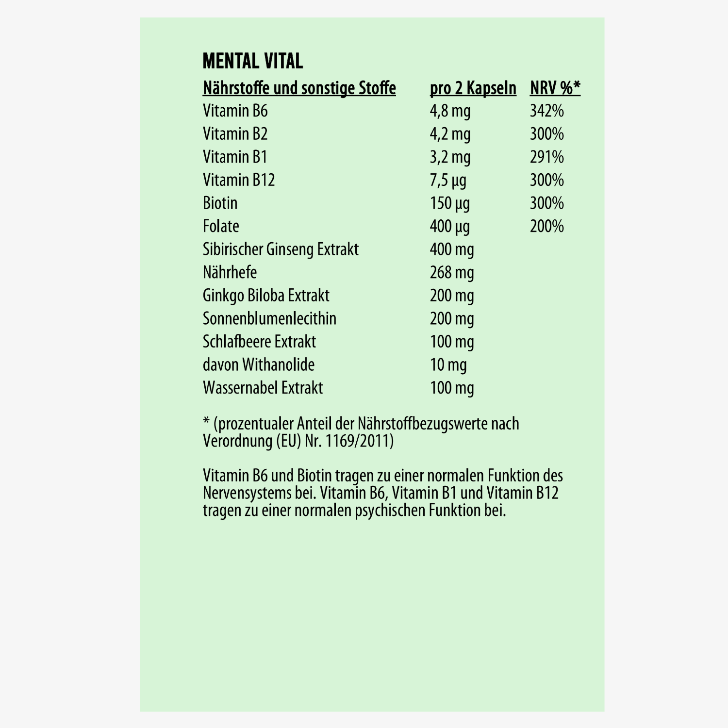 Braunes Glas mit goldfarbenem Deckel, beschriftet mit "Mental Vital" und Inhaltsstoffen wie B12, Lecithin, Ginkgo, Ginseng.