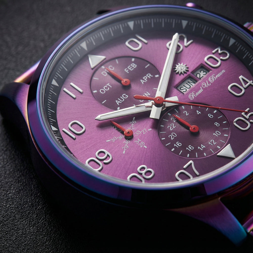 Die Raoul U. Braun Automatikuhr RUB05-0224G-RAM-pu-s verbindet markantes Design mit präziser Uhrmacherkunst. Das grosszügige 47-mm-Gehäuse aus Edelstahl ist hochwertig IP Rainbow-poliert und sorgt für eine auffällige, moderne Präsenz am Handgelenk.