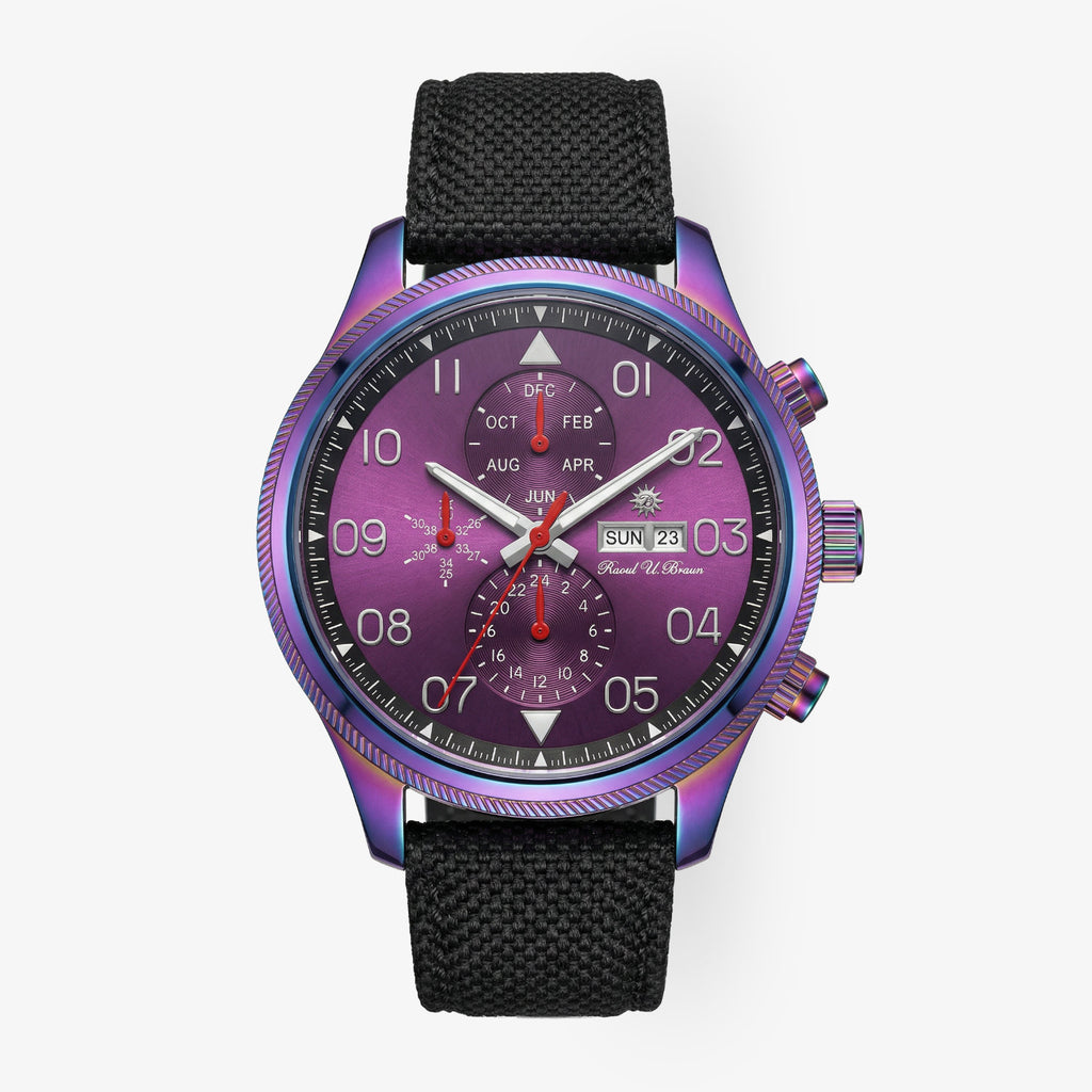 Die Raoul U. Braun Automatikuhr RUB05-0224G-RAN-pu-s ist ein Statement für Individualität und technische Vielfalt. Ihr grosszügiges 47-mm-Gehäuse aus poliertem IPRainbow-Edelstahl zieht alle Blicke auf sich und setzt farbige Akzente, ohne an Eleganz zu verlieren.