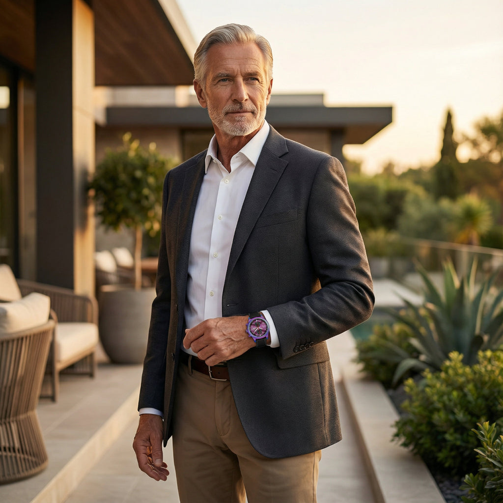 Das faszinierende Zifferblatt in Purple/Schwarz mit Sunburst-Schliff verleiht der Uhr Tiefe und Dynamik. Die klar angeordneten Anzeigen für Datum, Wochentag, Monat, Jahr und 24-Stunden-Anzeige machen diese Uhr zu einem funktionalen Zeitmesser für den Alltag und besondere Anlässe.