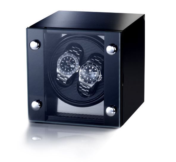 Eleganter Uhrenbeweger für zwei Automatikuhren mit hochwertigem Gehäuse aus Holz, Edelstahl und Glas im industriellen Design