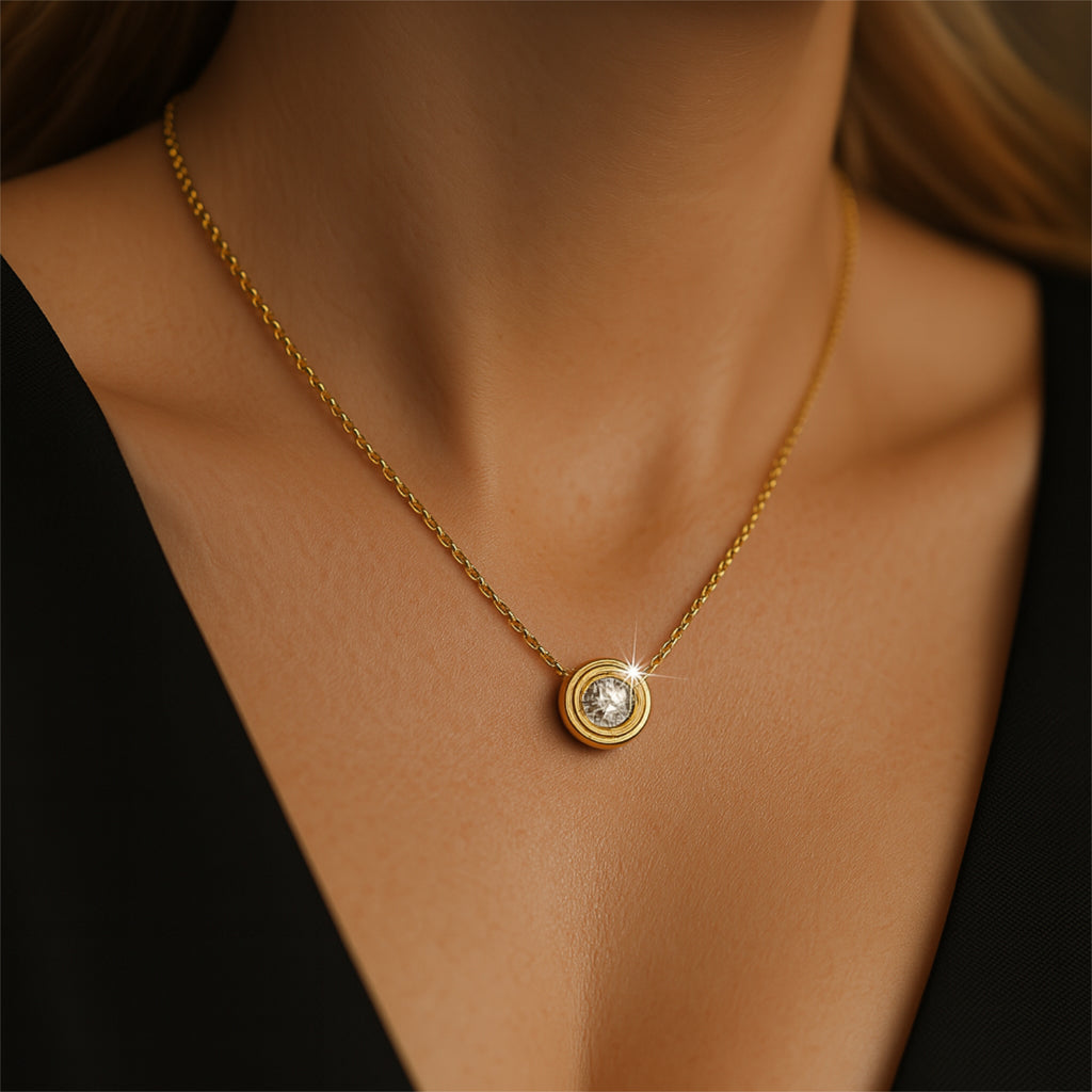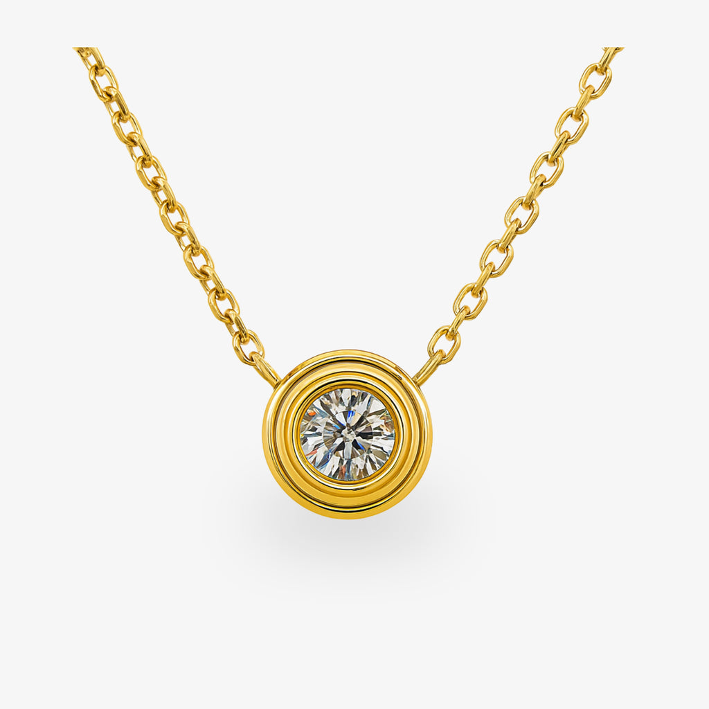 Goldene Halskette mit einem runden Diamantanhänger in einer Fassung auf weißem Hintergrund.