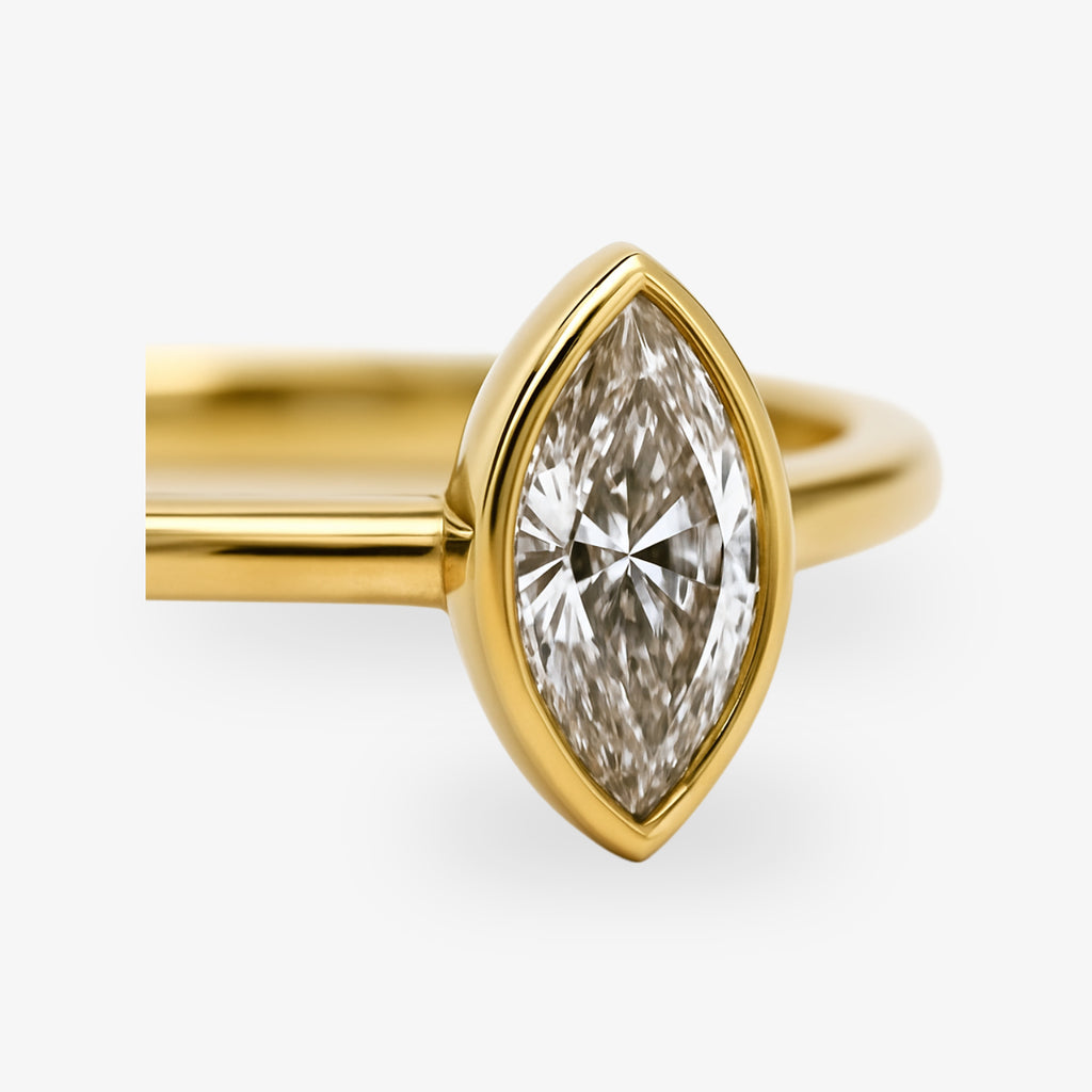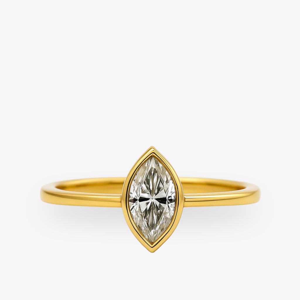 Goldener Ring mit marquiseförmigem Diamanten in der Mitte, vor weißem Hintergrund.