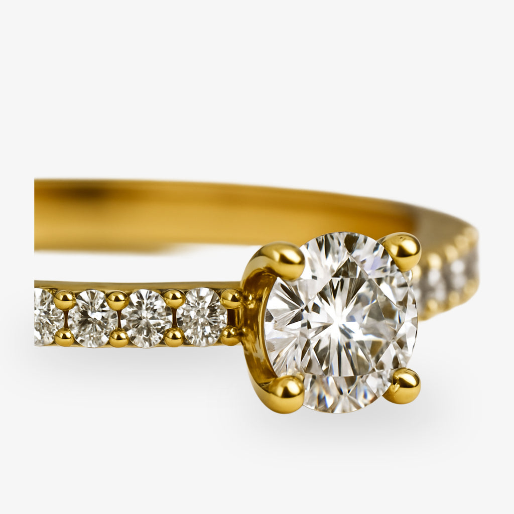 Ein eleganter Pavé-Solitär-Ring mit funkelndem Mittelstein und seitlichem Brillantschimmer – stilvoll, feminin und luxuriös.