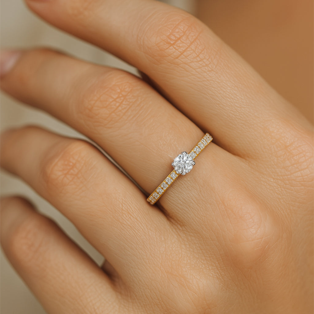 L'anello ANMOL Mia unisce la bellezza classica di un solitario alla lussuosa brillantezza di un delicato pavé. Al centro, un diamante coltivato in laboratorio da circa 0,3 ct, che brilla in modo particolarmente intenso grazie al suo colore (E-F) e alla sua purezza (VS).