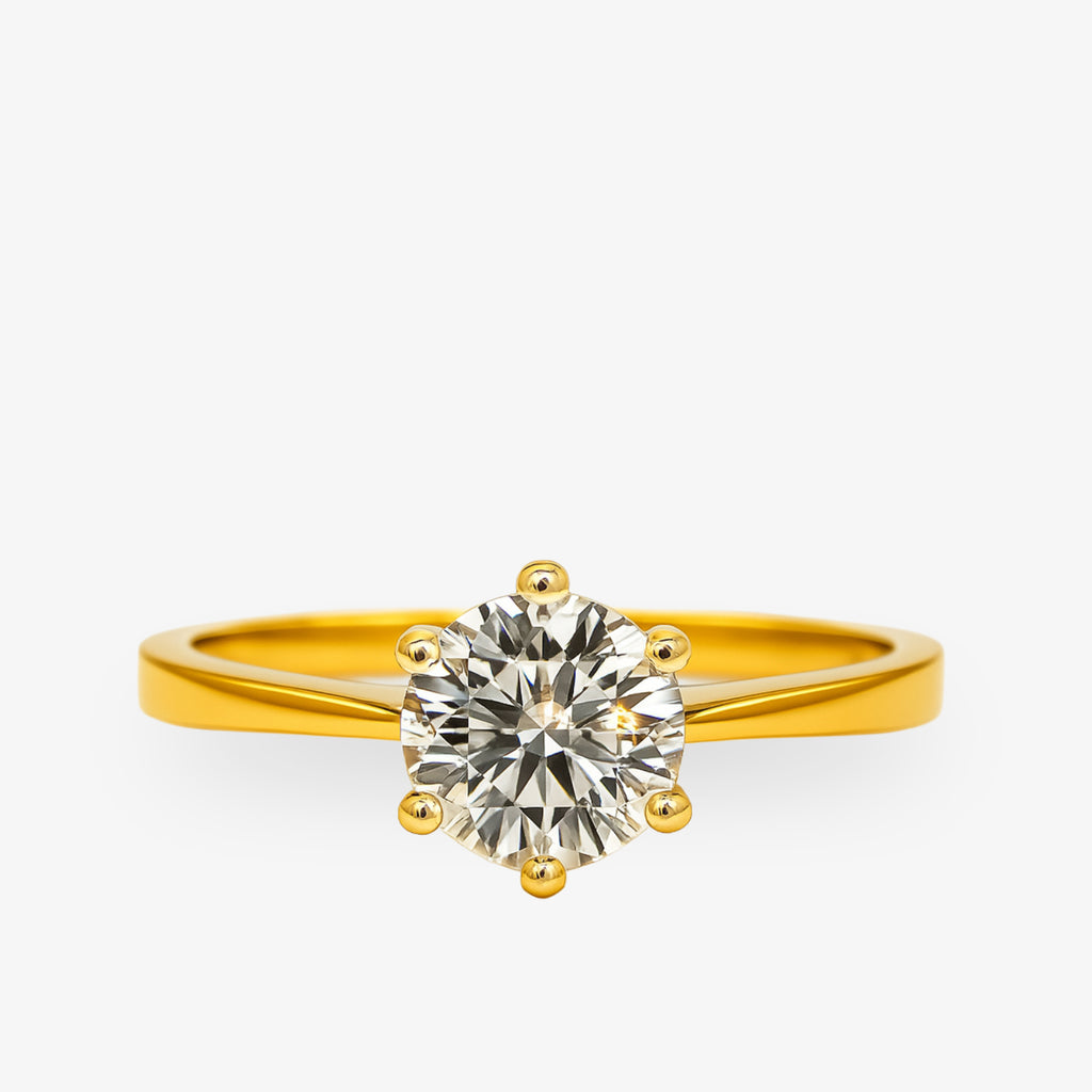 Goldener Ring mit großem, rundem Diamanten in Krappenfassung, vor weißem Hintergrund.