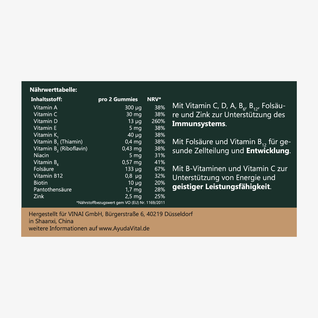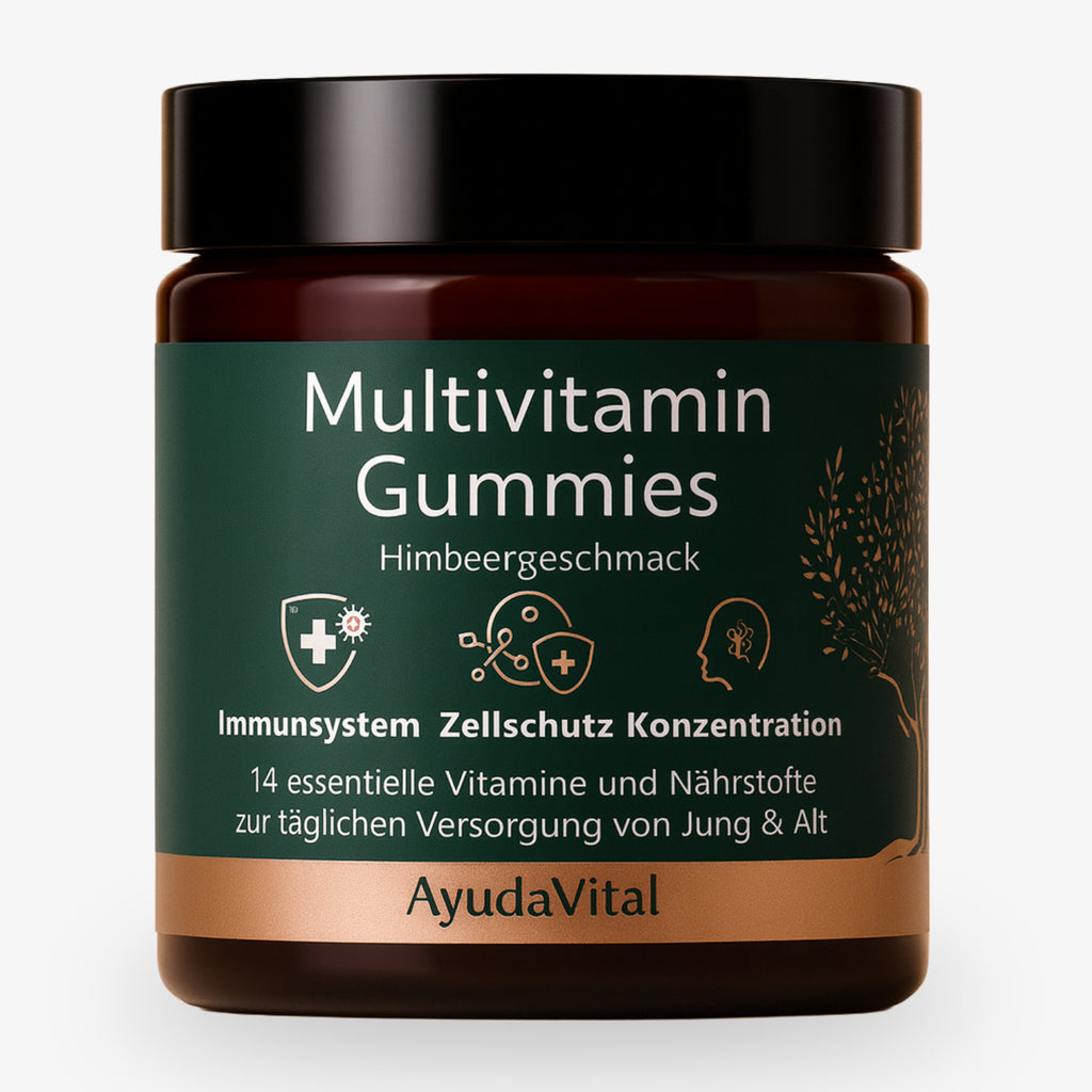 Mit den fruchtig-leckeren MULTIVITAMIN GUMMIES von AyudaVital wird die tägliche Versorgung mit wichtigen Mikronährstoffen zum Genuss – für Gross & Klein. Die Gummibärchen enthalten 14 sorgfältig ausgewählte Vitamine und Mineralstoffe, darunter Vitamin C, Vitamin D, B-Vitamine, Folsäure und Zink. Sie leisten einen wertvollen Beitrag zur normalen Funktion des Immunsystems, zur Energiegewinnung sowie zur Erhaltung gesunder Haut, Haare und Nägel.