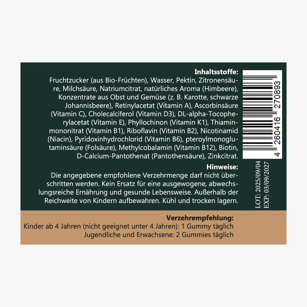Das Beste: Die Rezeptur ist speziell auf die Bedürfnisse von Kindern ab 4 Jahren sowie von Erwachsenen abgestimmt – mit 2 unterschiedlichen Verzehrmengen pro Altersgruppe. Die Gummibärchen sind mit natürlichem Himbeeraroma sowie mit Konzentraten aus Bio-Obst und Gemüse verfeinert und kommen ganz ohne künstliche Farbstoffe oder Gelatine aus.