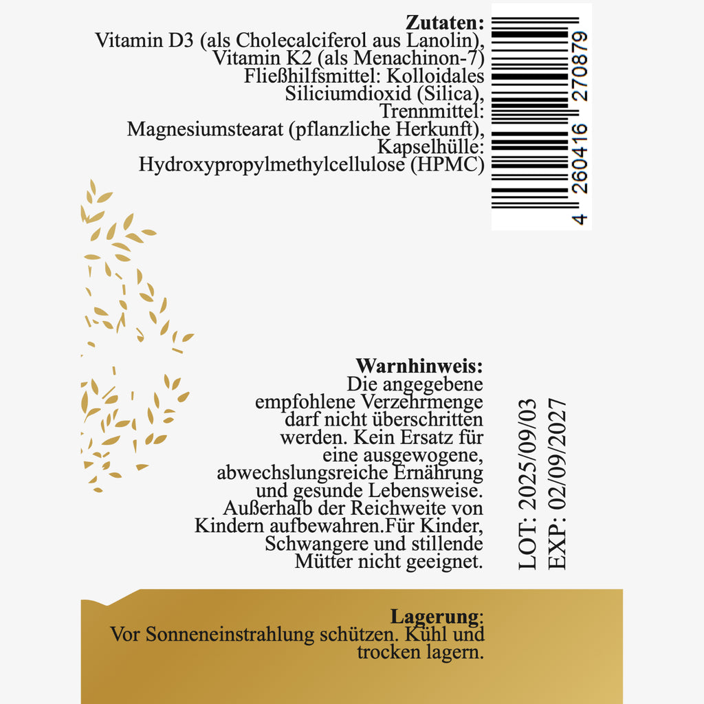 Vitamin D3 trägt dazu bei, die normale Aufnahme und Verwertung von Calcium zu unterstützen und ist somit für die Knochen-Erhaltung von zentraler Bedeutung. Gleichzeitig sorgt Vitamin K2 dafür, dass das aufgenommene Calcium an die richtigen Stellen im Körper – wie die Knochen – transportiert wird, anstatt sich in den Gefässen abzulagern.
