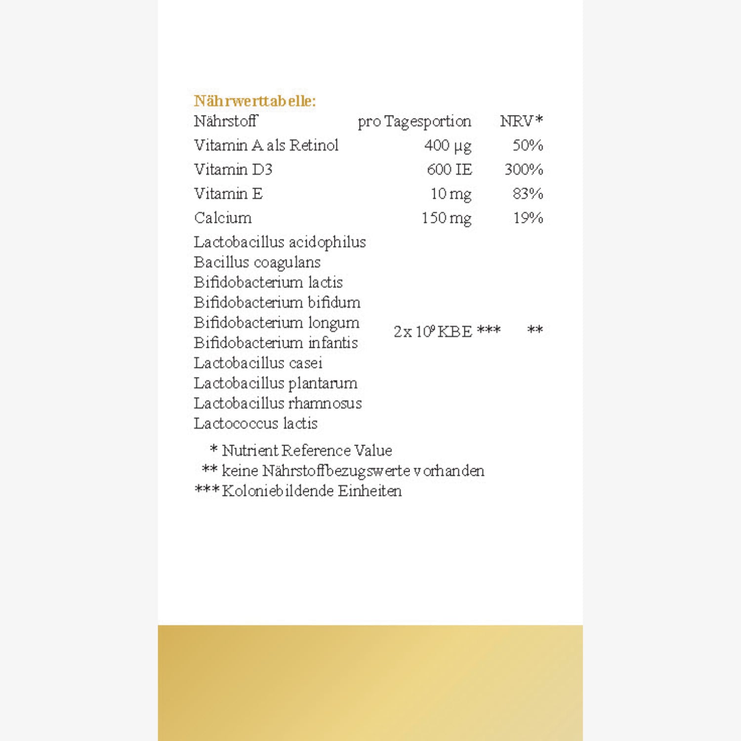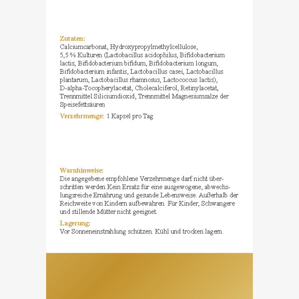 Das Produkt enthält eine speziell abgestimmte Mischung aus 9 Bakterien-Kulturen, darunter Lactobacillus acidophilus, Bifidobacterium lactis und Lactobacillus plantarum – allesamt Bakterienstämme, die natürlicherweise im menschlichen Darm vorkommen und zu einer gesunden Mikrobiota beitragen können.