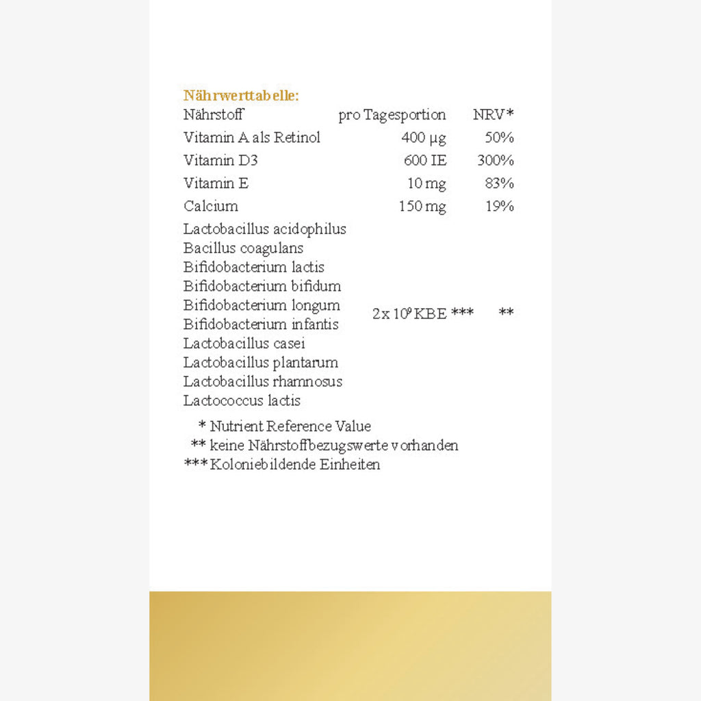Ergänzt wird die Rezeptur durch Calcium, das nachweislich zu einer normalen Funktion der Verdauungsenzyme beiträgt. Vitamin A unterstützt den Erhalt gesunder Schleimhäute, insbesondere auch im Magen-Darm-Trakt. Vitamin D unterstützt das Immunsystem, während Vitamin E als Zellschutz gegen oxidativen Stress wirkt.
