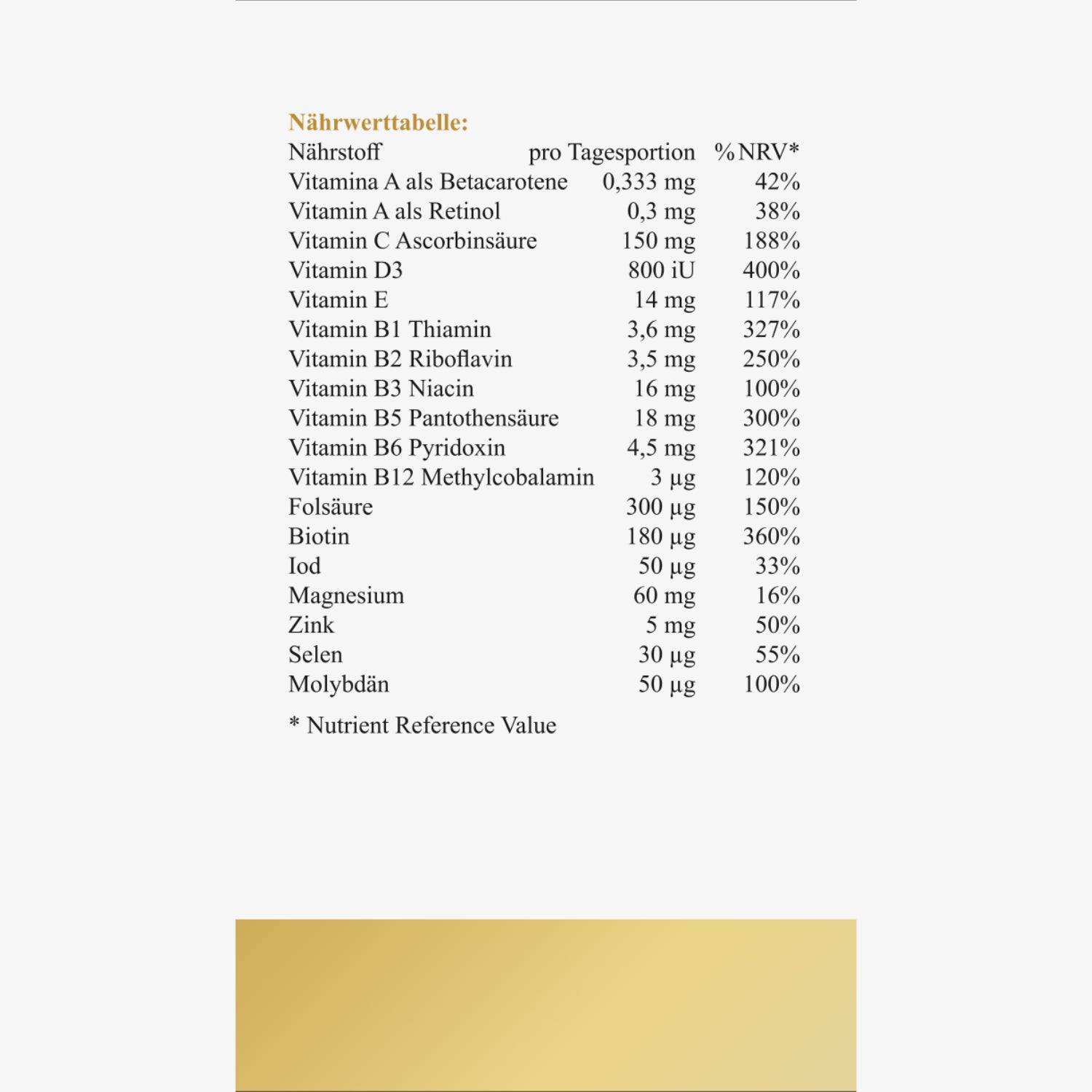Basierend auf einem vollständigen Spektrum aus Vitaminen – A, C, D, E, B-Komplex –, Mineralstoffen – Zink, Selen, Magnesium u. a.–, Coenzym Q10 sowie Omega‑3-Fettsäuren unterstützt sie Sie in vielen zentralen Bereichen Ihres Wohlbefindens.