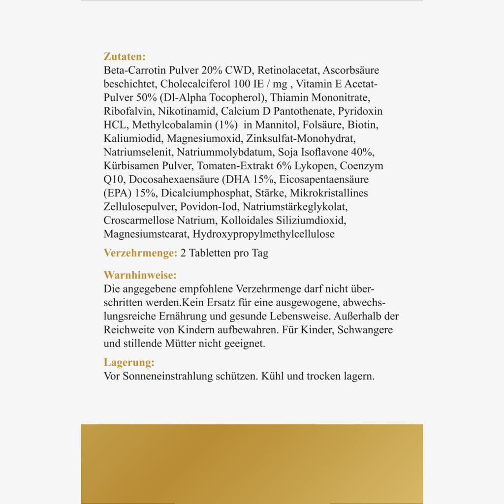 Zusätzlich enthält die Rezeptur Soja‑Isoflavone, Kürbiskernpulver und Tomaten-Extrakt (Lykopin), die in wissenschaftlichen Studien mit hormoneller Balance, Prostata und antioxidativem Schutz in Verbindung gebracht werden.