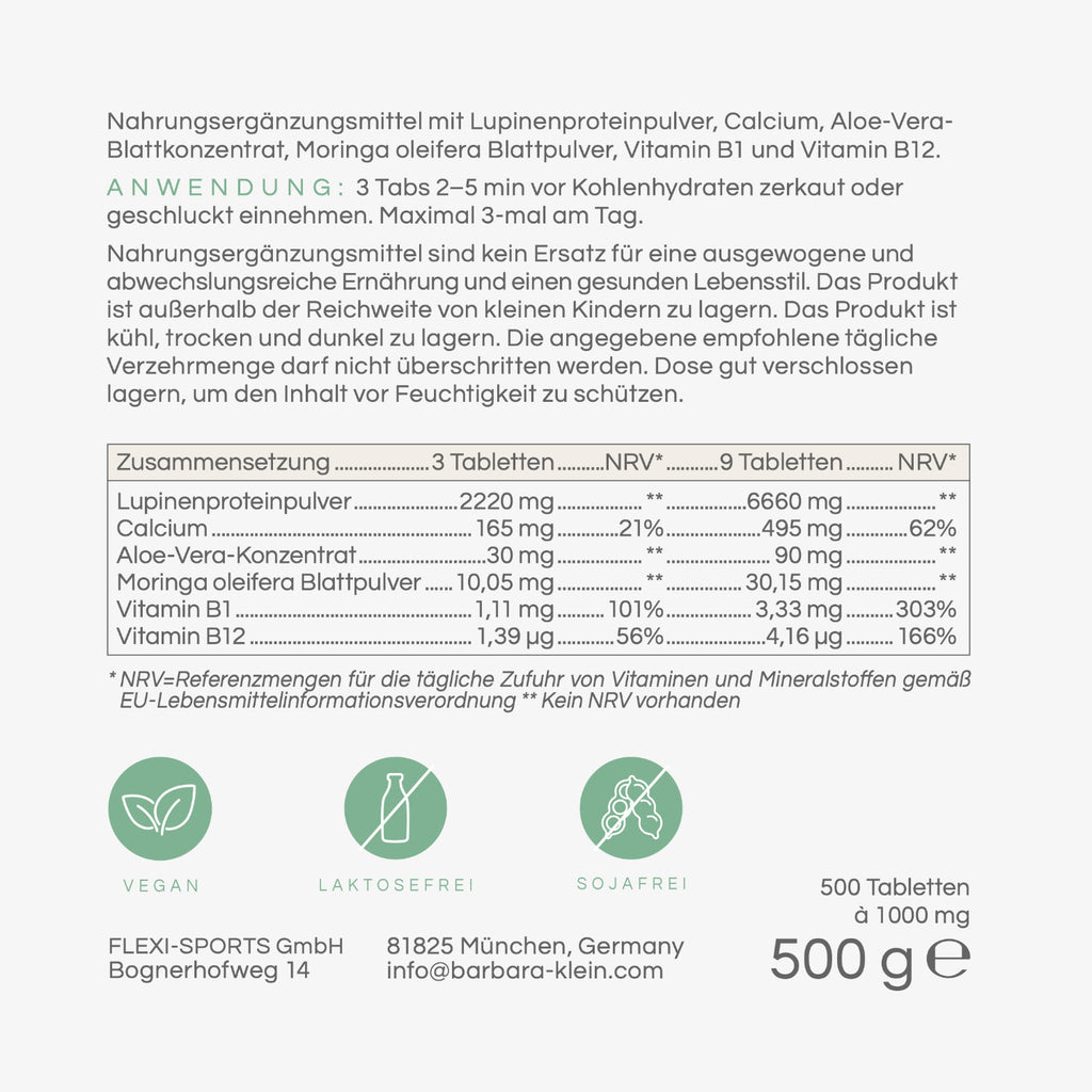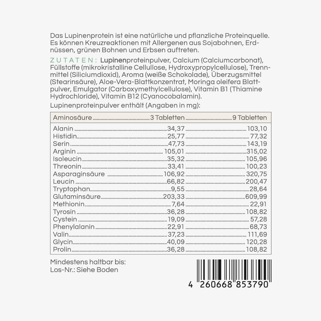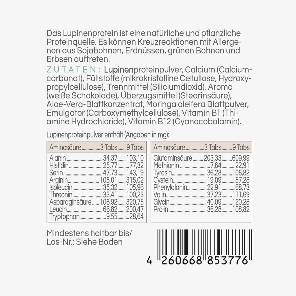 Le compresse di aminoacidi LUPINCHEN di Barbara Klein sono compresse di alta qualità con proteine di lupino di origine vegetale, combinate con sostanze vitali selezionate come calcio, vitamina B1 e vitamina B12 , ideali per l'apporto quotidiano di elementi costitutivi essenziali per le strutture cellulari, i muscoli e il metabolismo energetico.