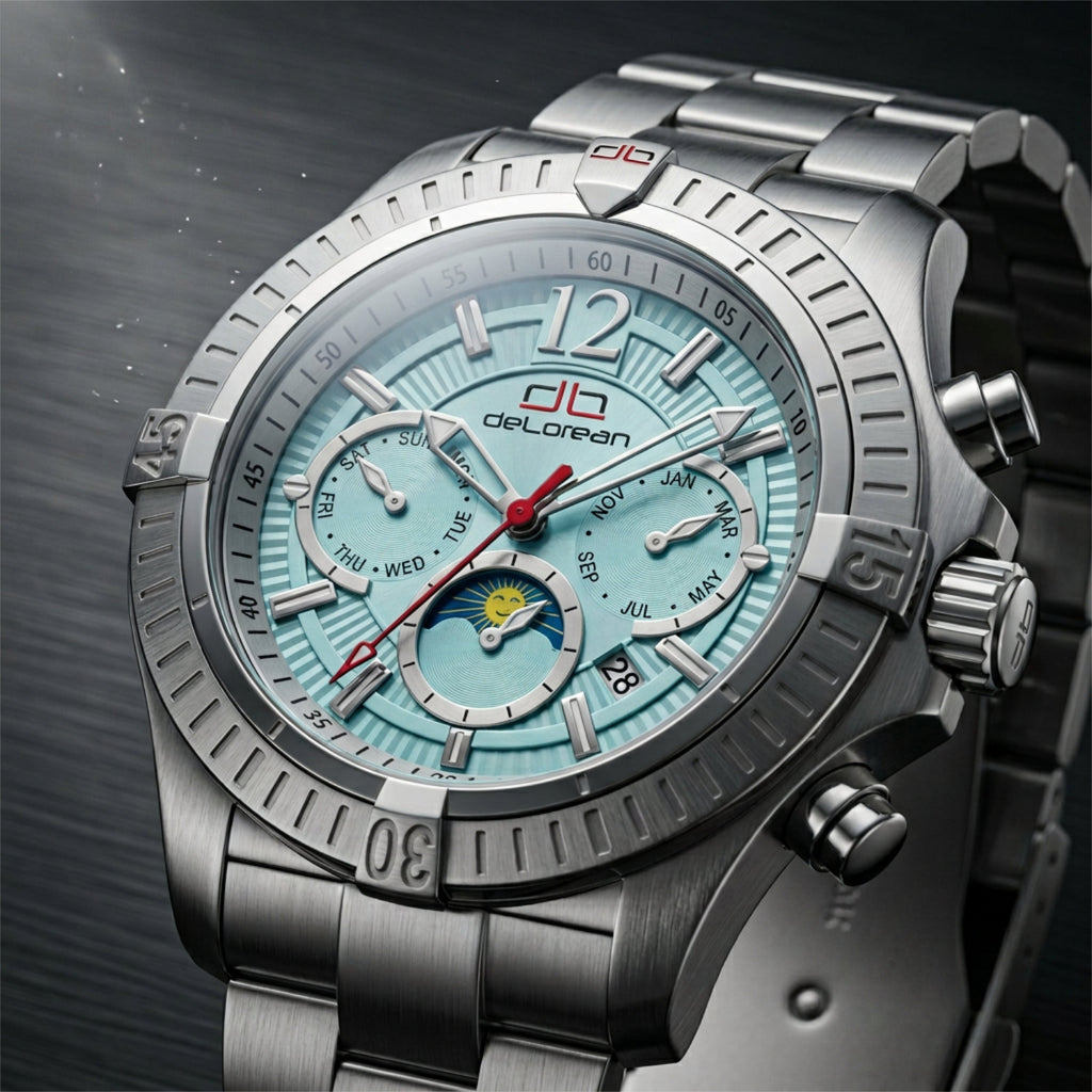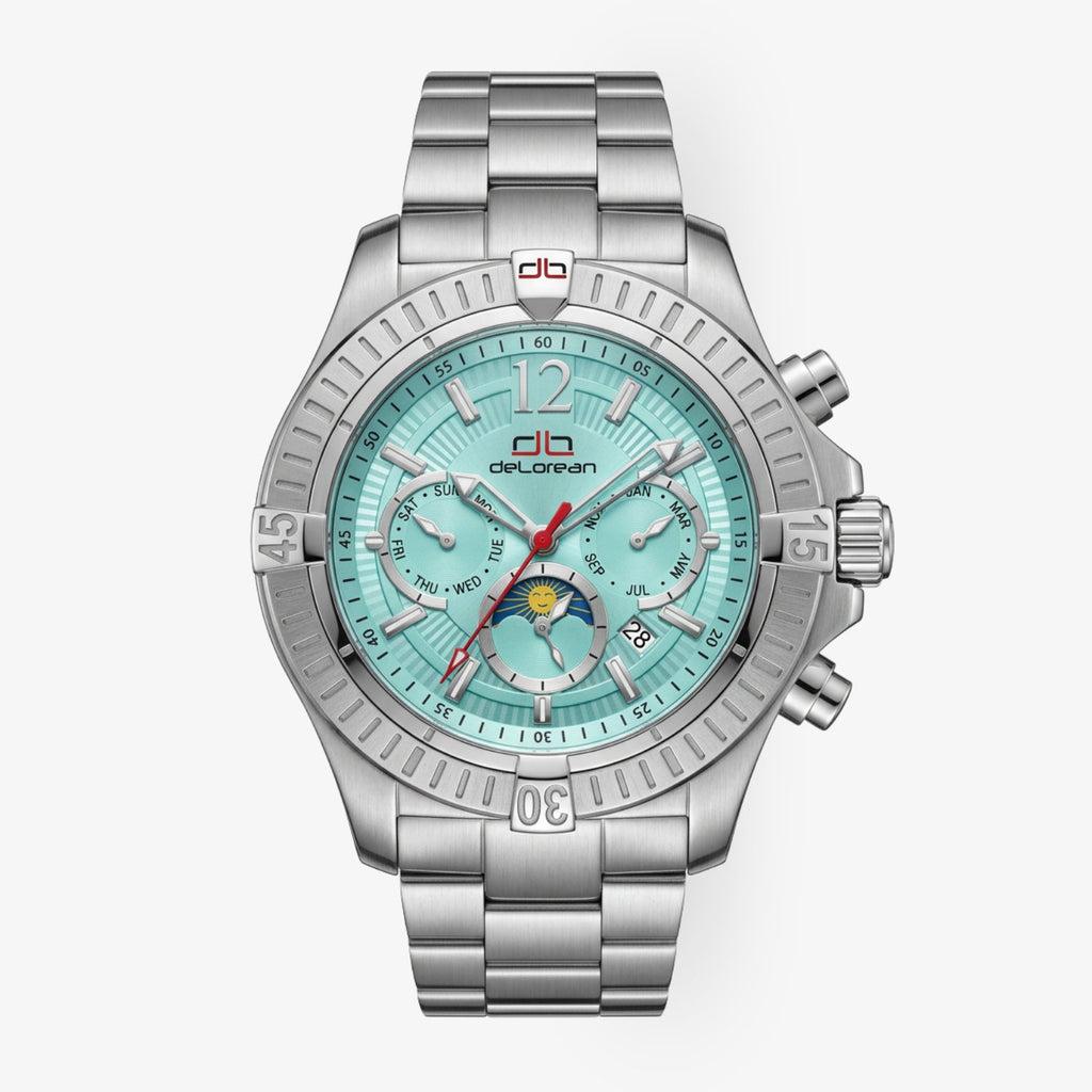 Die deLorean DL05-1270-SS-tif «FANGIO» ist ein Statement für Individualität und Performance. Das auffällige Tiffany-farbene Zifferblatt verleiht der Uhr eine moderne und exklusive Ausstrahlung, während die klare Formsprache den sportlichen Charakter unterstreicht.