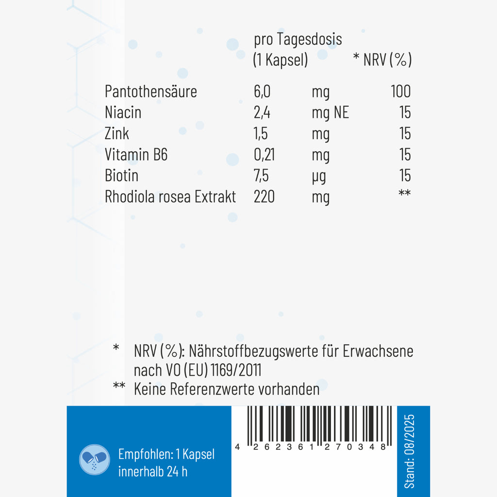 DocPlum BRAIN combina cinque micronutrienti essenziali con la Rhodiola rosea, un fitochimico utilizzato nella naturopatia tradizionale. Le vitamine del gruppo B e lo zinco contribuiscono alla normale funzione psicologica, alle prestazioni cognitive e al normale funzionamento del sistema nervoso.