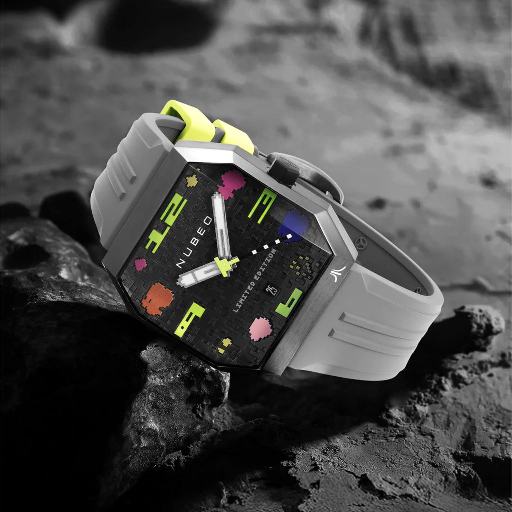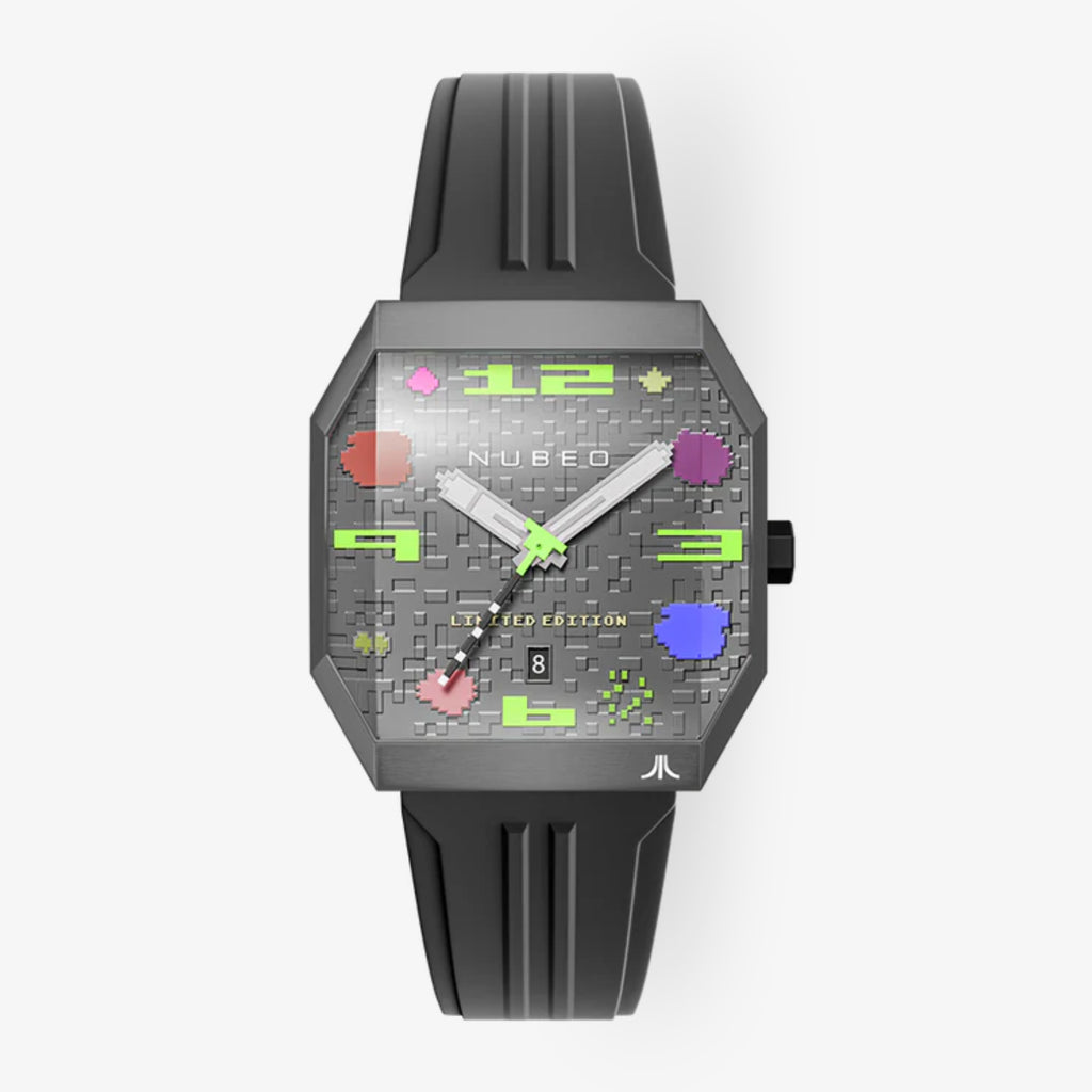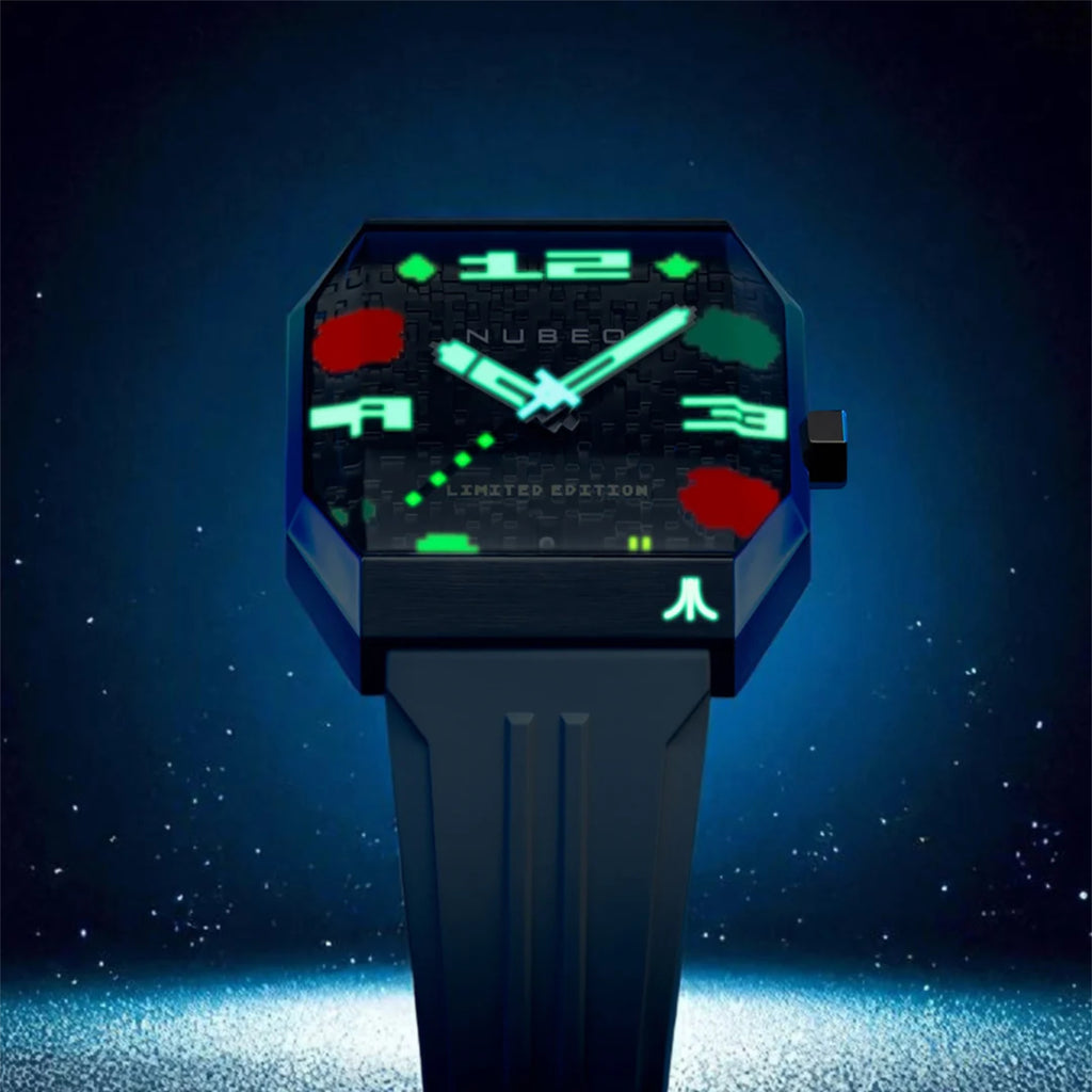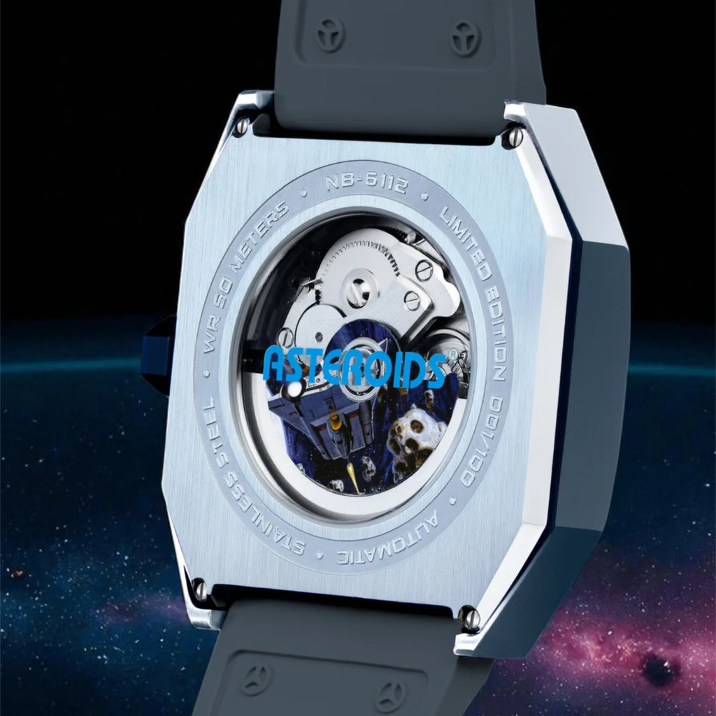 La «Nubeo CONSOLE Automatic ATARI 2600 ASTEROIDS – COSMIC VOID – Limited Edition» è un omaggio a uno dei più famosi giochi arcade di tutti i tempi. Ispirata all'iconica console ATARI 2600 e al classico Asteroids, unisce nostalgia e raffinata arte orologiera.