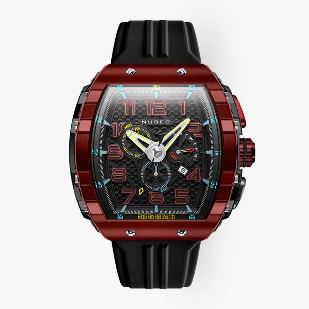 Il "Nubeo MAGELLAN RETROGRADE Chronograph – Crimson Red" colpisce per la sua caratteristica cassa tonneau in acciaio inossidabile, nella sorprendente combinazione di colori nero e rosso cremisi. Il design, con viti decorative, fondello a vite in acciaio inossidabile, due pulsanti e corona incisa, sottolinea il carattere sportivo e tecnico di questo orologio.