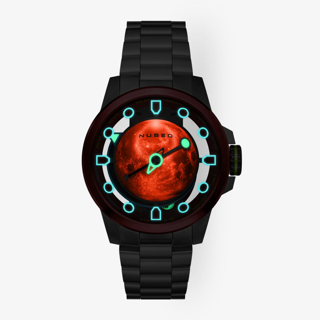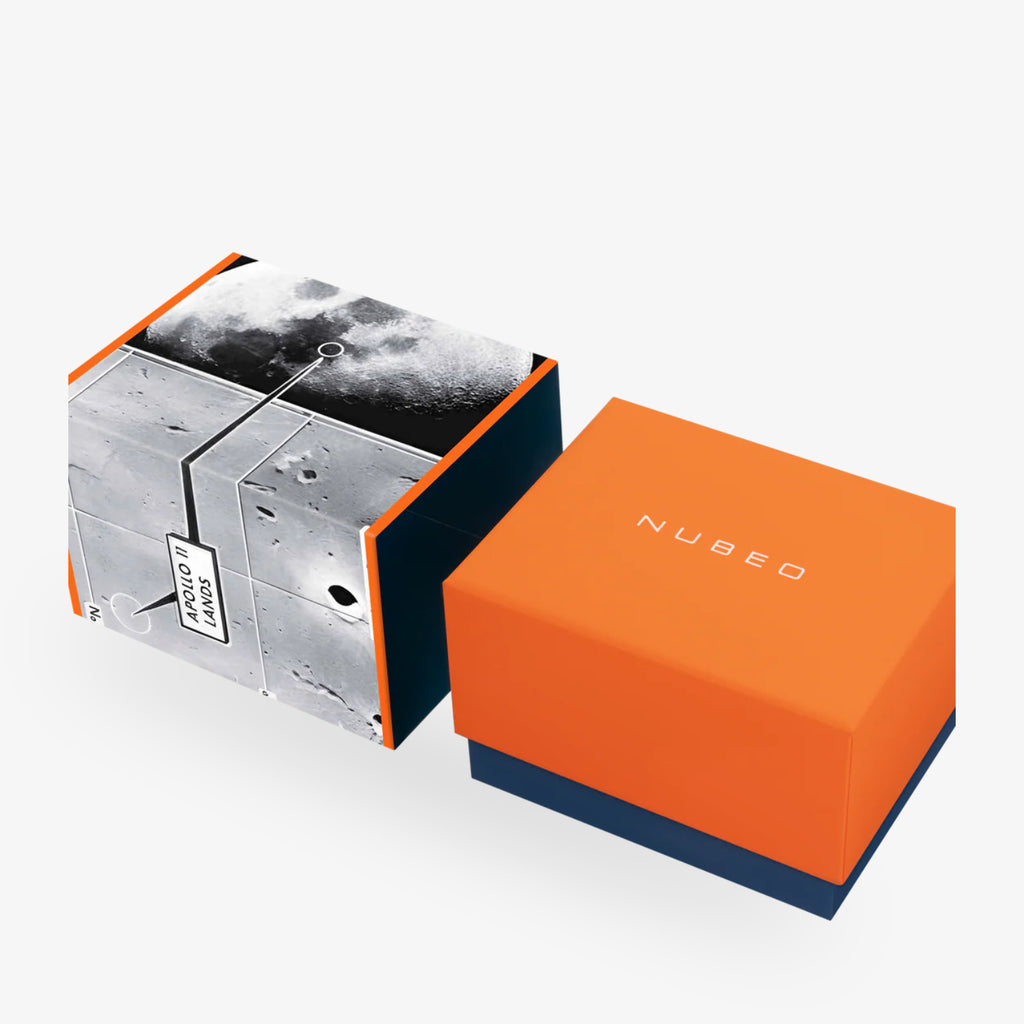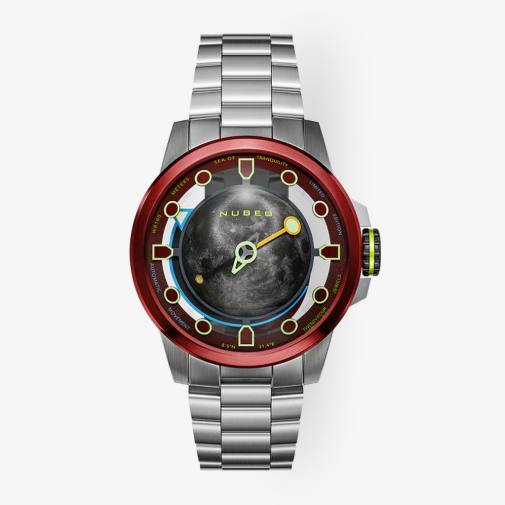Il modello «Nubeo TRANQUILITY Automatic – GIBBOUS RED – Limited Edition» è ispirato alla missione Apollo 11 del 1969 e al leggendario luogo di atterraggio «Mare Tranquillitatis». La particolarità di questo orologio è il quadrante tridimensionale e bombato, che riprende la curvatura e il profilo della Luna. Ogni quadrante viene stampato individualmente in 3D con resina luminescente, conferendo all'orologio un aspetto ineguagliabile, quasi planetario.