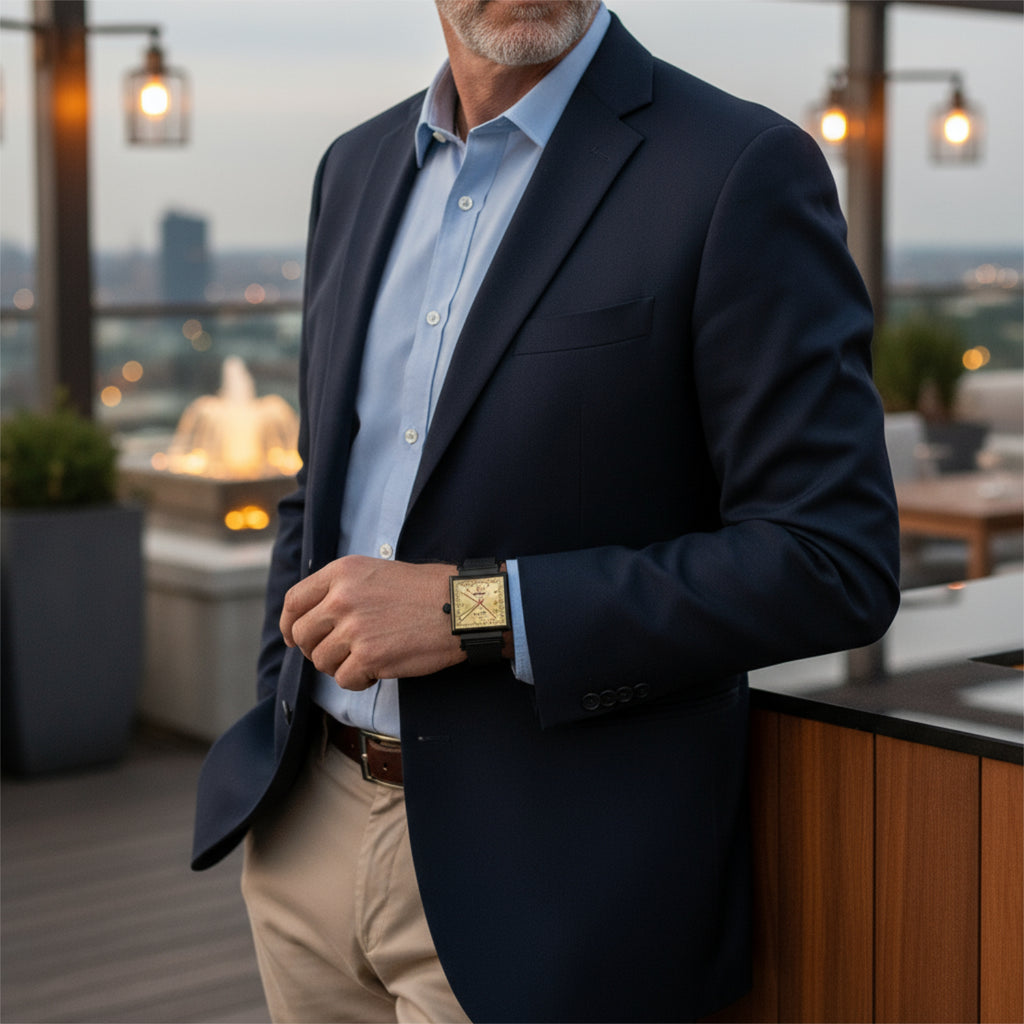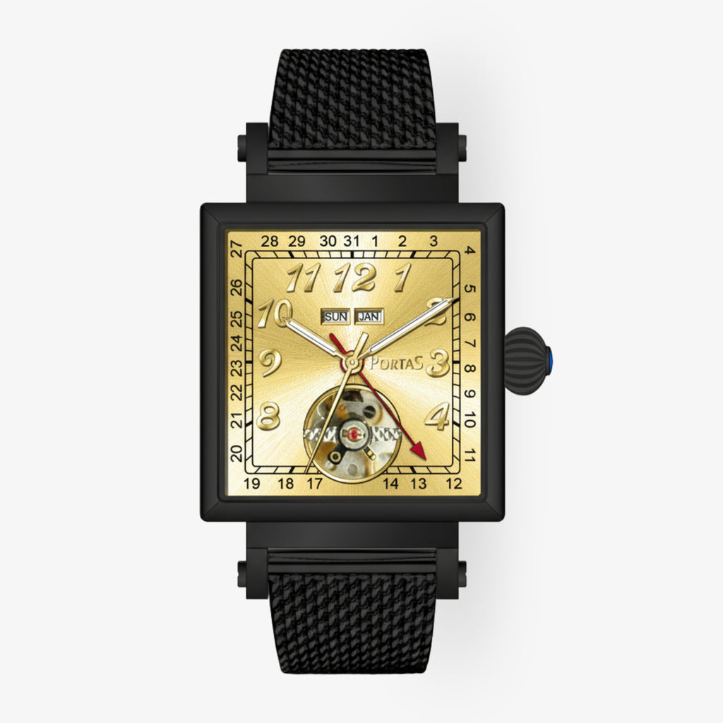 Die PortaS Automatikuhr «Hommage 1770» Black & Gold ist ein Symbol für moderne Eleganz und technische Präzision. Das eckige Gehäuse aus IP-Black/DLC-beschichtetem Edelstahl verleiht der Uhr eine sportlich-edle Ausstrahlung, während der gravierte Gehäuseboden mit dem Wappen Sachsens ihre Herkunft und Handwerksqualität würdigt.