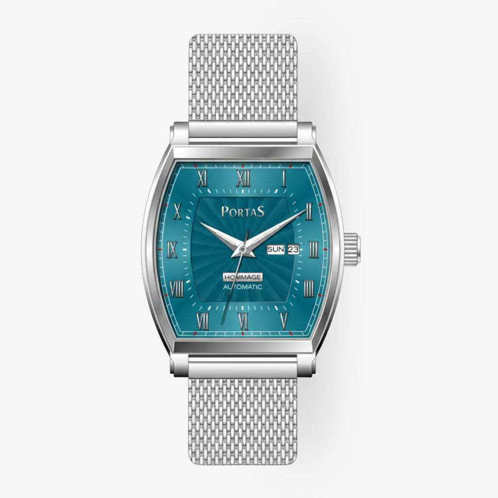 Die PortaS Automatikuhr «Hommage 1770» Petrol Edition besticht durch ihre aussergewöhnliche Kombination aus markanter Form und edler Farbgebung. Das Tonneau-förmige Gehäuse aus Edelstahl verleiht der Uhr eine unverwechselbare Silhouette, während das robuste Mineralglas optimalen Schutz bietet.