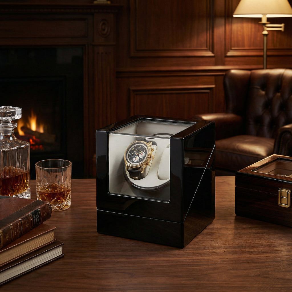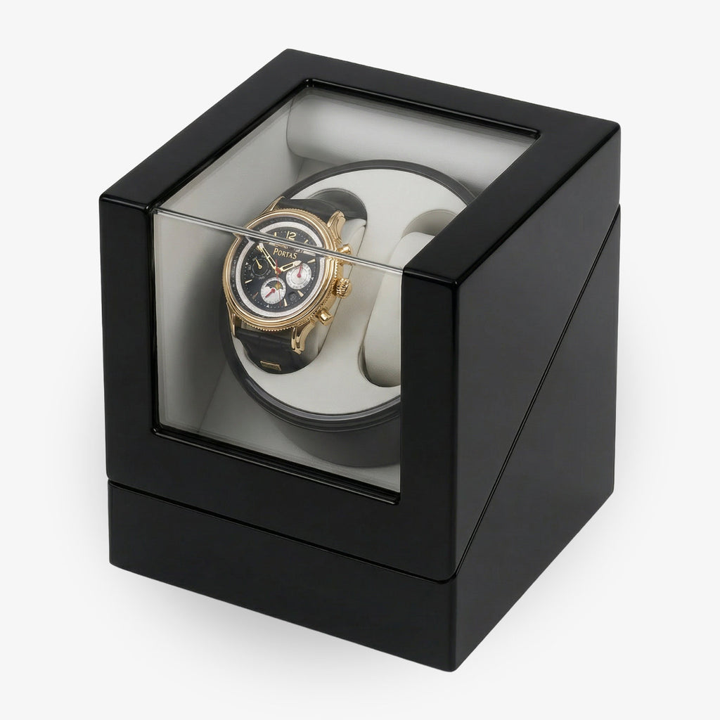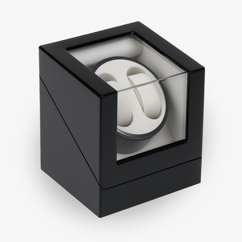 Der hochwertige Uhrenbeweger «Kubus» im Klavierlack-Finish rundet das Set ab: Er hält die Automatikuhr jederzeit einsatzbereit, verhindert das Stehenbleiben des Werkes und schützt Ihre Uhr mittels Samtfutter optimal. Vier Programme ermöglichen individuelle Rotationsmodi, passend für nahezu jedes Automatikwerk.