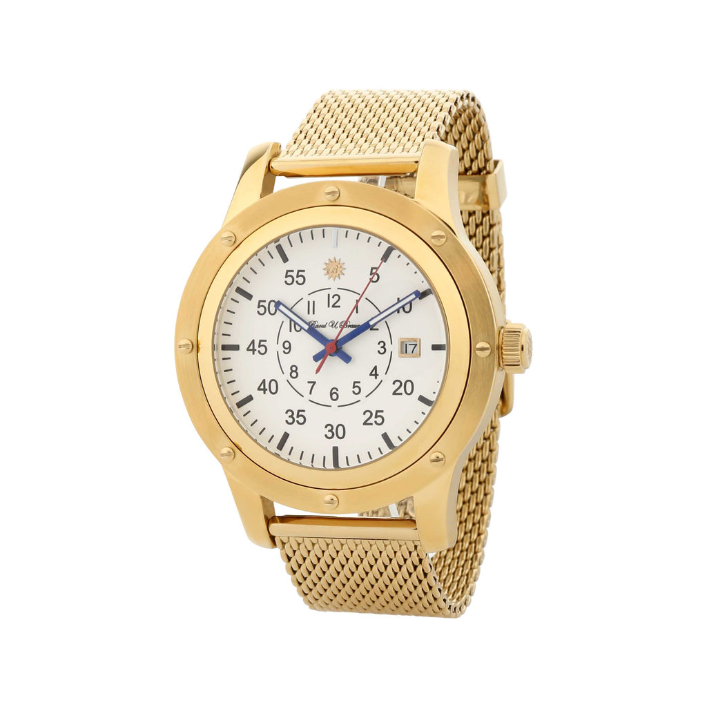 Das weisse Zifferblatt ist klassisch gestaltet mit schwarzen Ziffern, blauen fluoreszierenden Zeigern, rotem Sekundenzeiger und einem Datumsfenster. Für hohen Tragekomfort sorgt das massive Edelstahl-Milanaiseband in Goldoptik mit Logogravur auf der Dornschliesse.
