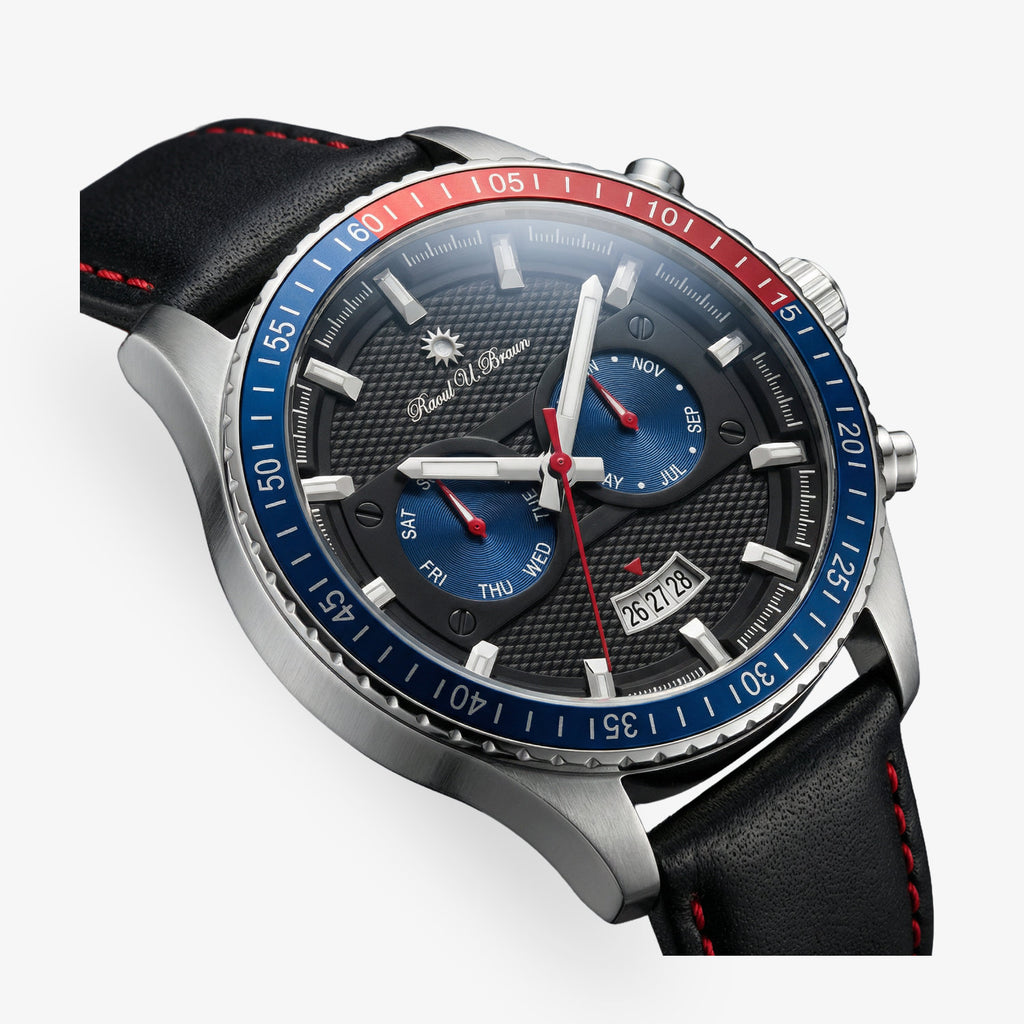 Die Raoul U. Braun Automatikuhr RUB05-0551-SL-s-bl ist für Herren konzipiert, die ein sportlich-elegantes Design mit technischer Präzision verbinden möchten. Das 44 mm grosse Edelstahlgehäuse sorgt für eine markante Präsenz am Handgelenk, während die zweifarbige Lünette den sportlichen Charakter der Uhr betont.