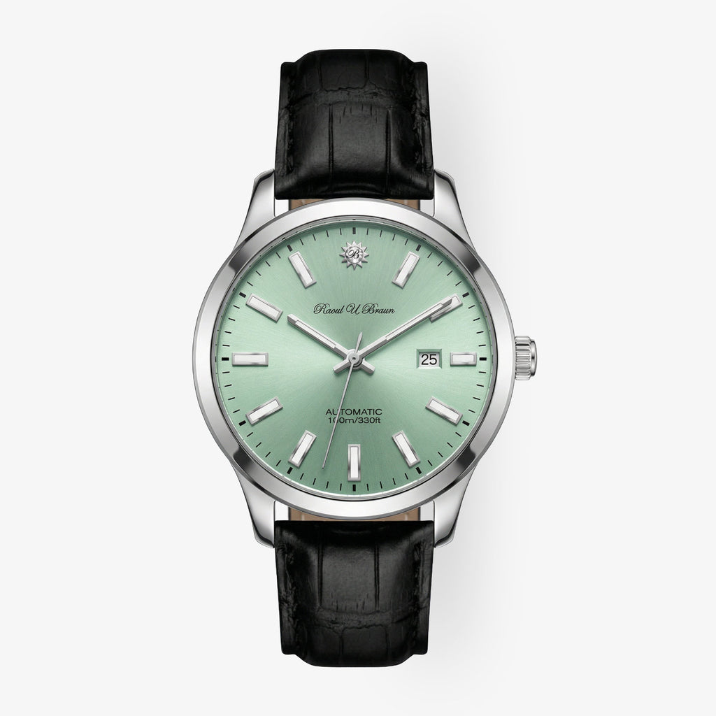 L' orologio automatico Raoul U. Braun RUB05-8215-SL-mint "London", limitato a 44 pezzi in tutto il mondo, coniuga la classica maestria orologiera con un design moderno. La cassa in acciaio inossidabile da 45 mm garantisce un look accattivante, mentre il quadrante sunburst color menta crea riflessi vivaci a seconda della luce.