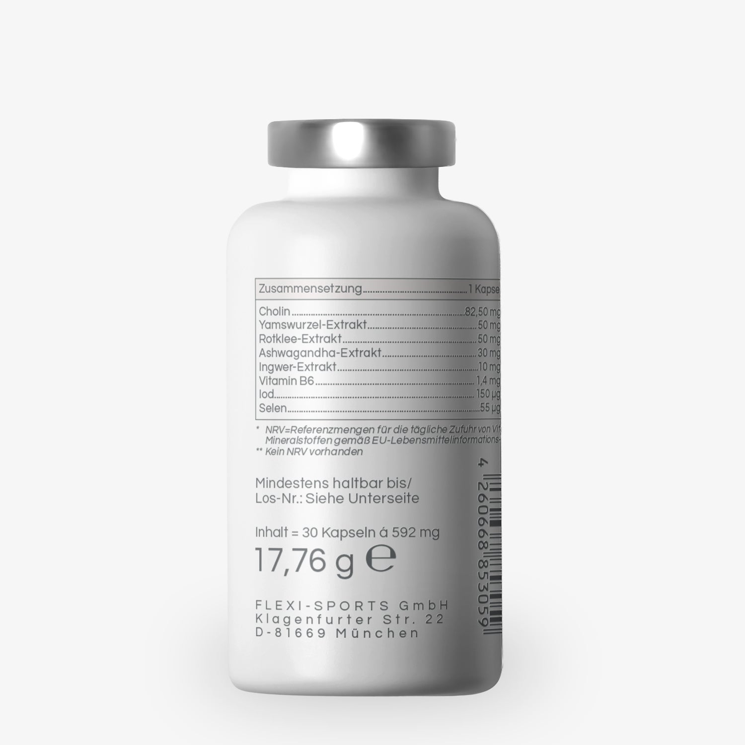 Rotklee, reich an Isoflavonen – sogenannten Phyto-Östrogenen – kann helfen den Hormonhaushalt, der sich in den Wechseljahren umstellt, zu stabilisieren. Gemeinsam mit Yamswurzel, Ashwagandha und Ingwer-Extrakt bildet er die pflanzliche Basis dieses Präparats – inspiriert von der Naturheilkunde. Ergänzt wird die Formel durch Cholin, Vitamin B6, Jod und Selen – Nährstoffe, die gezielt zur Unterstützung der Regulierung des Hormonhaushalts, zur Unterstützung des Nervensystems sowie zur Erhaltung normaler Haut, Haare und Nägel beitragen.