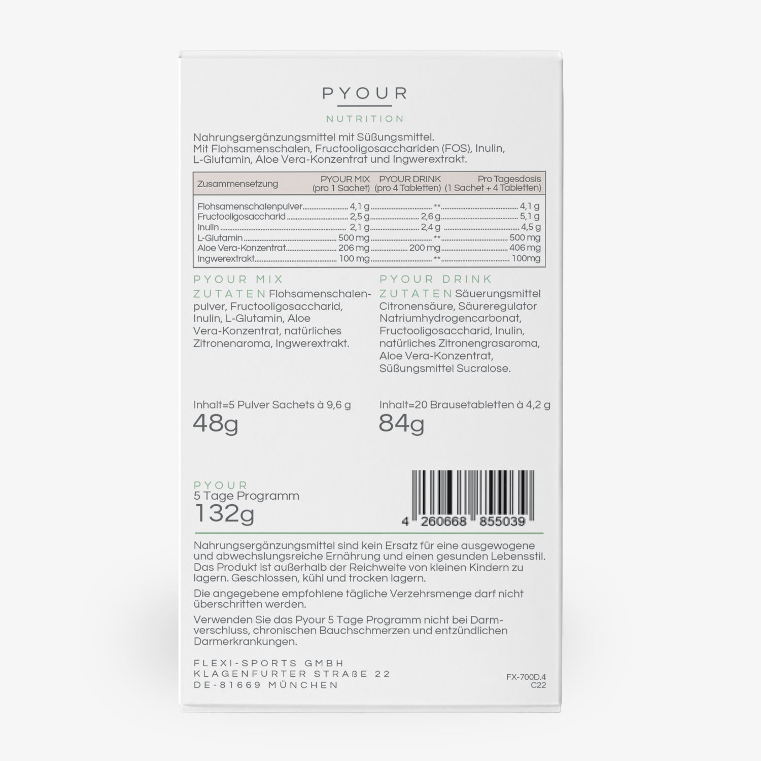 5 Sachets PYOUR MIX mit Flohsamenschalen, Inulin, Fructooligosacchariden, Aloe Vera, L-Glutamin und Ingwer
