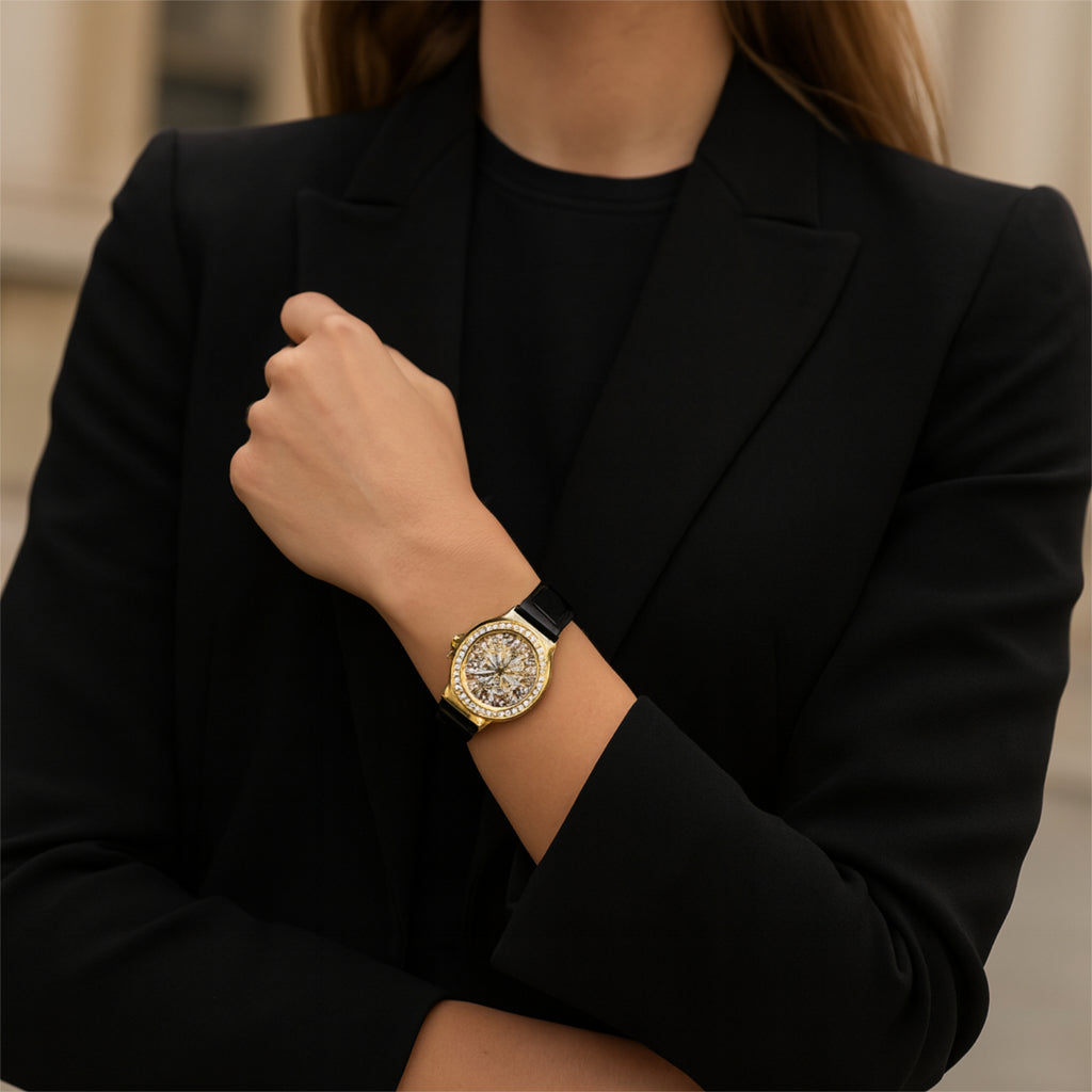 Das ebenfalls mit Kristallen verzierte Zifferblatt in IP-Gold harmoniert perfekt mit den goldfarbenen Zeigern. Die erhabenen schwarzen arabischen Zahlen sorgen für beste Ablesbarkeit. Die Zeiger sind zusätzlich weiss lumineszierend, was der Uhr auch bei schlechten Lichtverhältnissen Funktionalität verleiht.