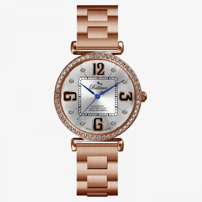 Die Bellevue Swiss Made F.406 ist eine Hommage an klassische Schweizer Handwerkskunst und feminine Eleganz. Das polierte IP-Roségold-Gehäuse mit kristallbesetzter Lünette betont die luxuriöse Erscheinung der Uhr. Das silberfarbene Zifferblatt mit feinem Sonnenschliff und Guillochierung wird von acht funkelnden Kristallen geziert, während schwarze arabische Zahlen für perfekte Ablesbarkeit sorgen.