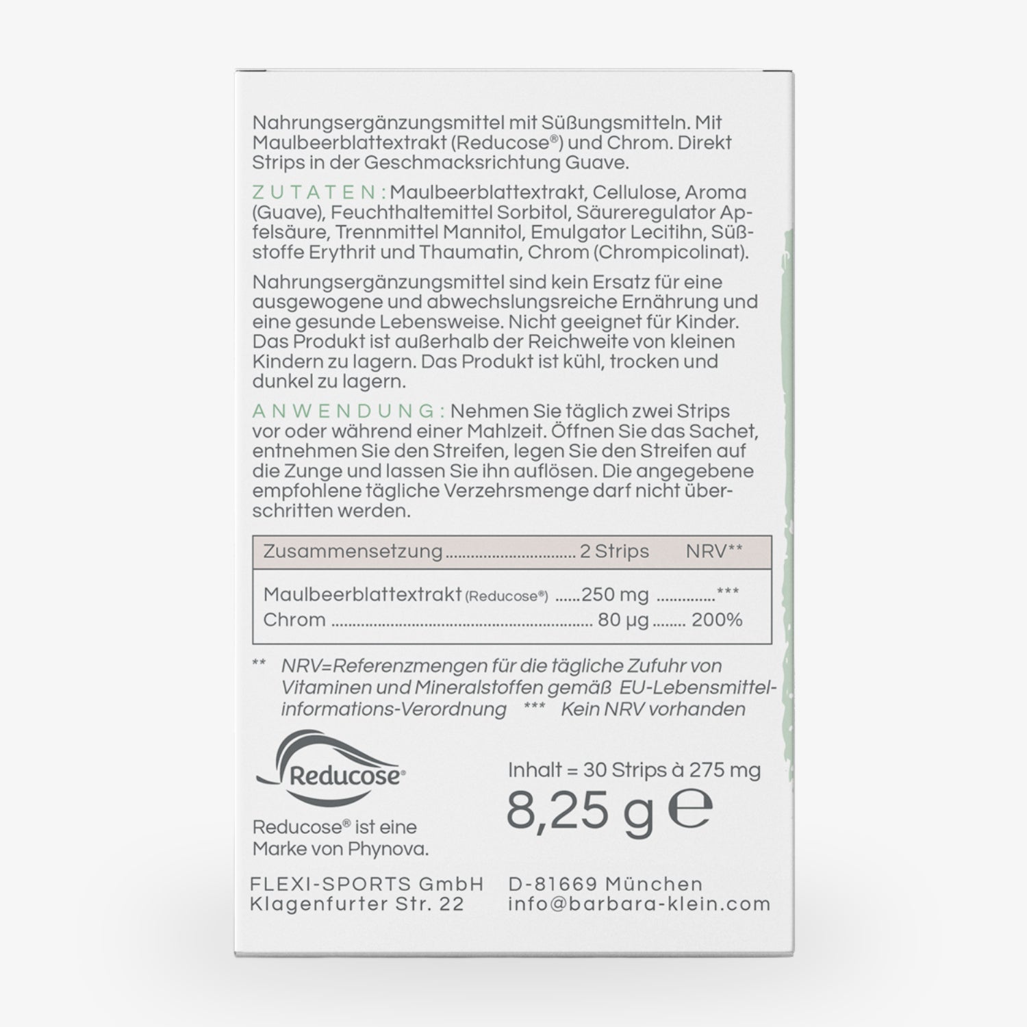 Die Strips basieren auf dem patentierten Wirkstoff Reducose®, einem natürlichen Maulbeerblatt-Extrakt, der Blutzuckerschwankungen minimiert, indem er verhindert das Kalorien aus Kohlenhydraten sofort verstoffwechselt werden. Ergänzt wird die Formel durch Chrom,