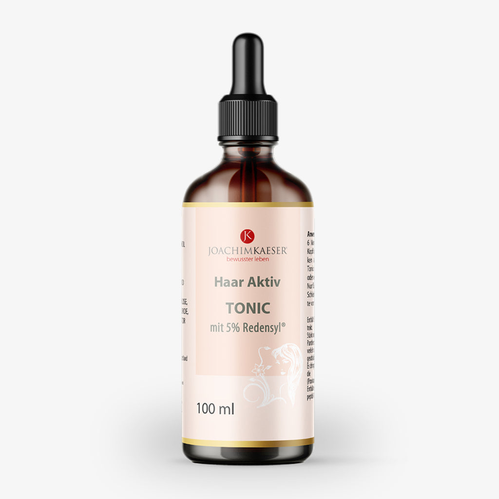 Das Haar Aktiv Tonic ergänzt die Wirkung von aussen. Mit 5 % Redensyl® in Studiendosierung sowie Kamelien- und Lärchen-Extrakt stimuliert es die Haarfollikel, fördert das Haarwachstum und reduziert Haarausfall.