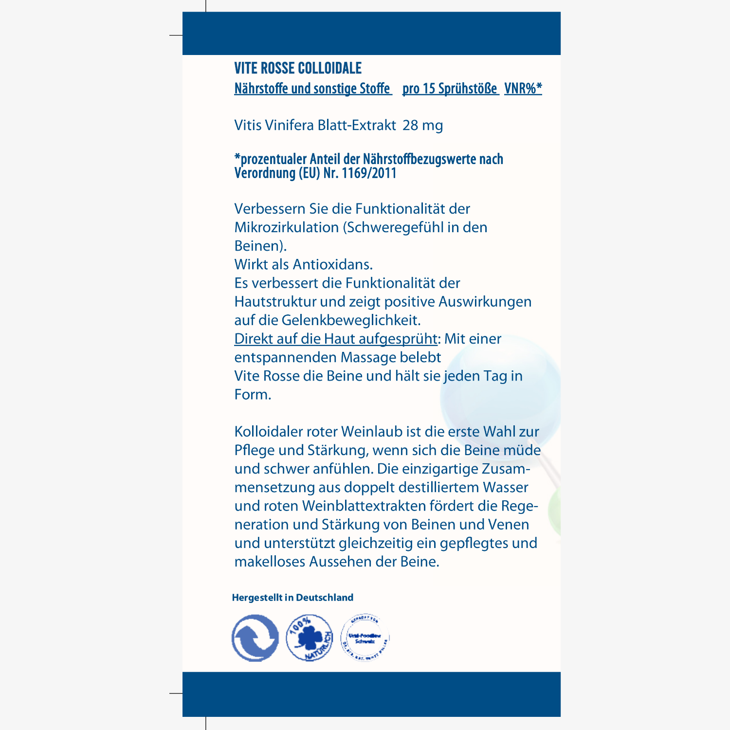 Intensivbehandlung für müde oder schwere Beine. Am besten morgens und abends oder nach Bedarf auf die betroffenen Stellen an Knöcheln und Beinen sprühen und verteilen. Mit einer entsprechenden Massage belebt Vite Rosse die Beine und hält sie in Form.