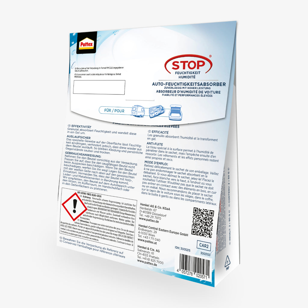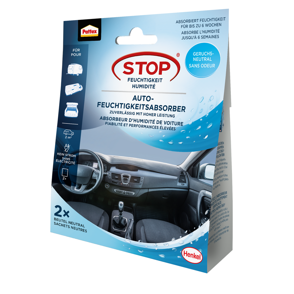 Der Pattex AERO 360° Auto Sachet wirkt bis zu 6 Wochen pro Beutel und unterstützt ein trockenes und angenehmes Klima – ganz ohne lästiges Tropfen oder Nachfüllen. So schützen Sie Ihr Auto, Ihre Textilien und empfindliche Gegenstände zuverlässig vor Schimmel, Stockflecken und Feuchtigkeitsschäden.