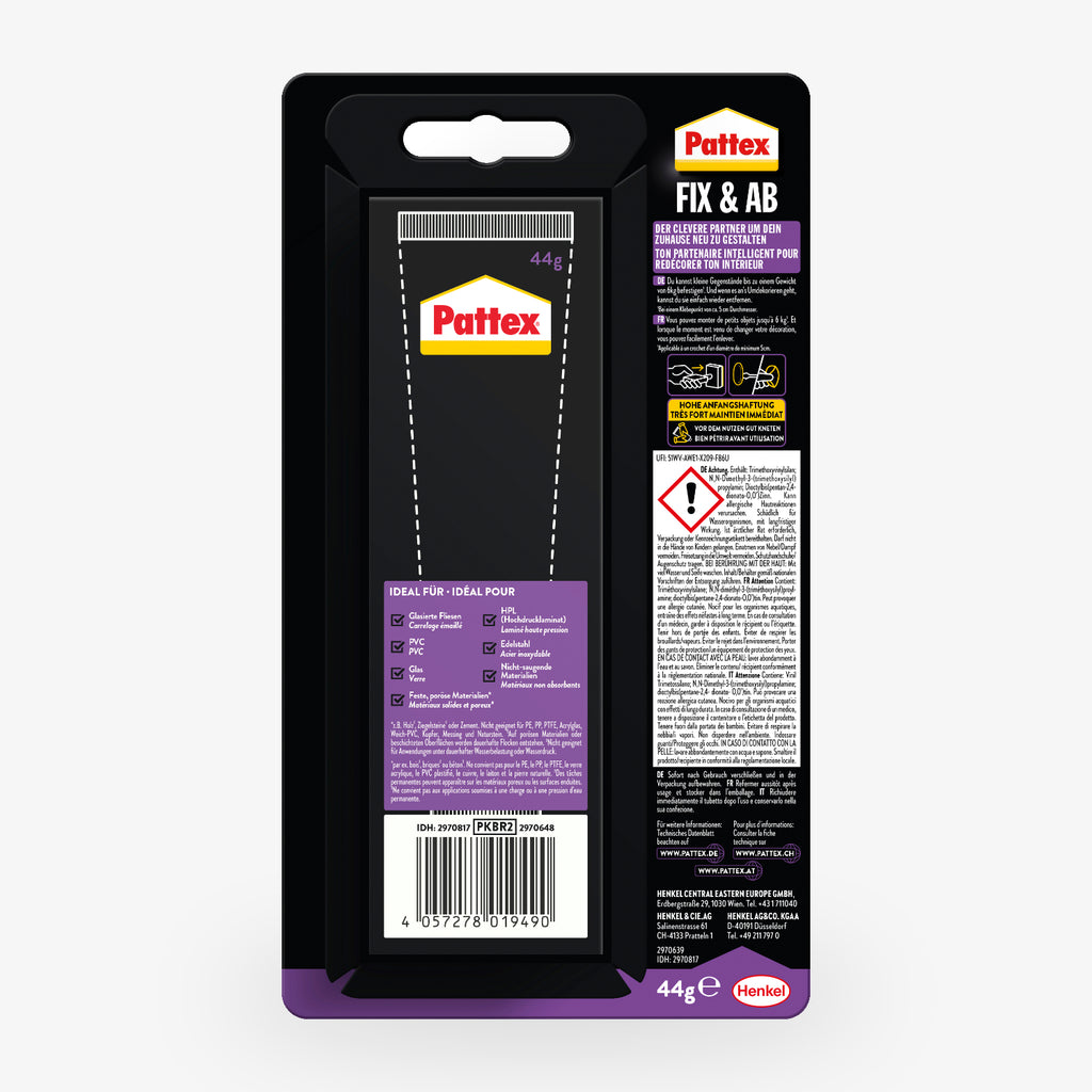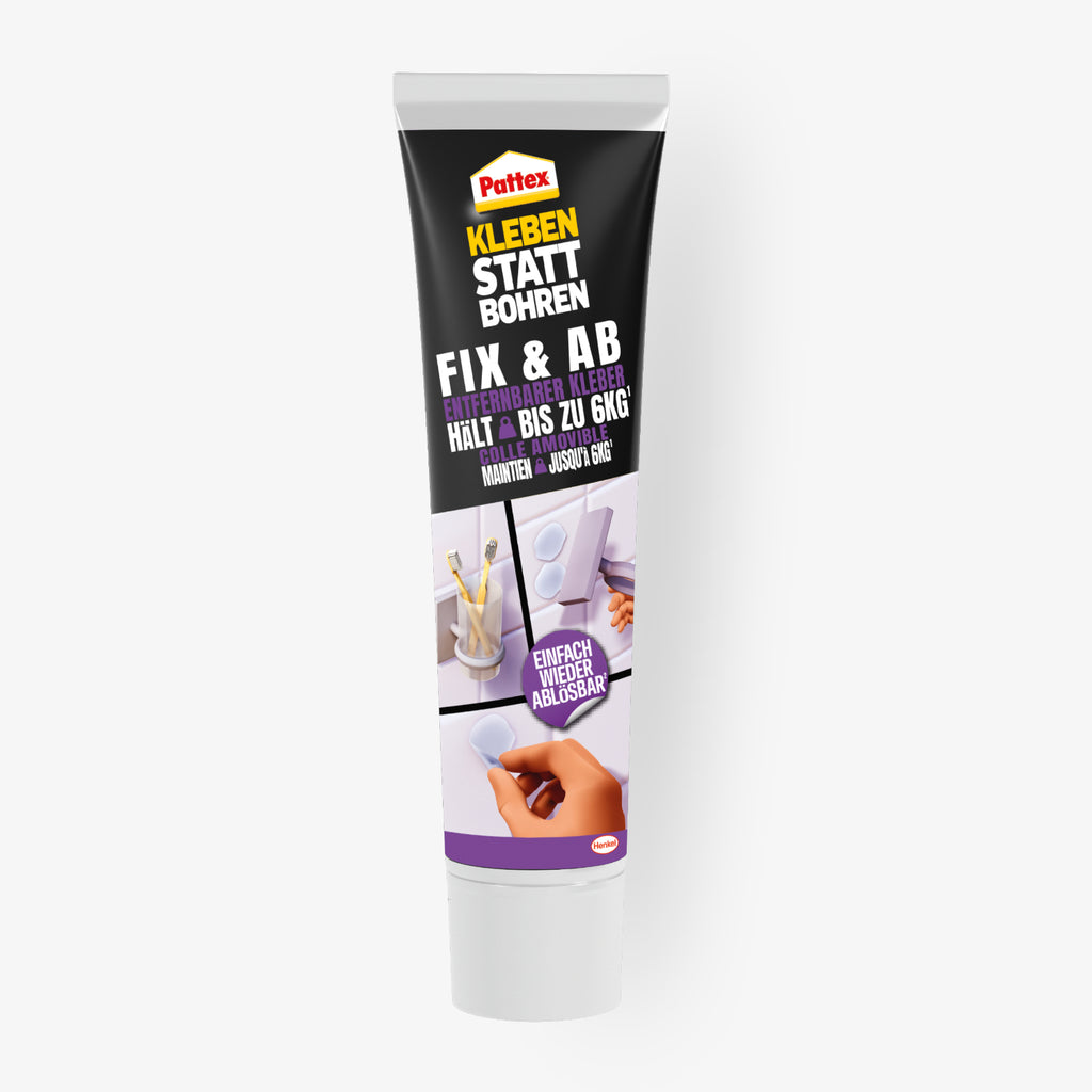 Der Pattex «Kleben statt Bohren» FIX & AB Kleber ist die praktische Alternative zum Bohren. Ideal, wenn Sie Haken, Leisten, kleine Regale, Lampenhalter oder Küchen- und Bad-Utensilien anbringen möchten – schnell, sauber, ohne Werkzeug und wieder ablösbar.