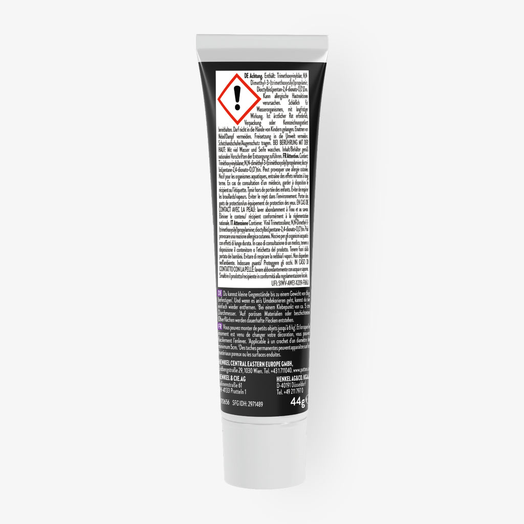 Dank seiner starken Haftung sorgt der Kleber für festen Halt und kann Gegenstände bis zu 6 Kilogramm pro Klebepunkt zuverlässig tragen. Die wasserfeste Formel ist speziell für feste, nicht poröse Oberflächen wie Fliesen, Glas, Edelstahl, PVC oder Holz entwickelt worden.