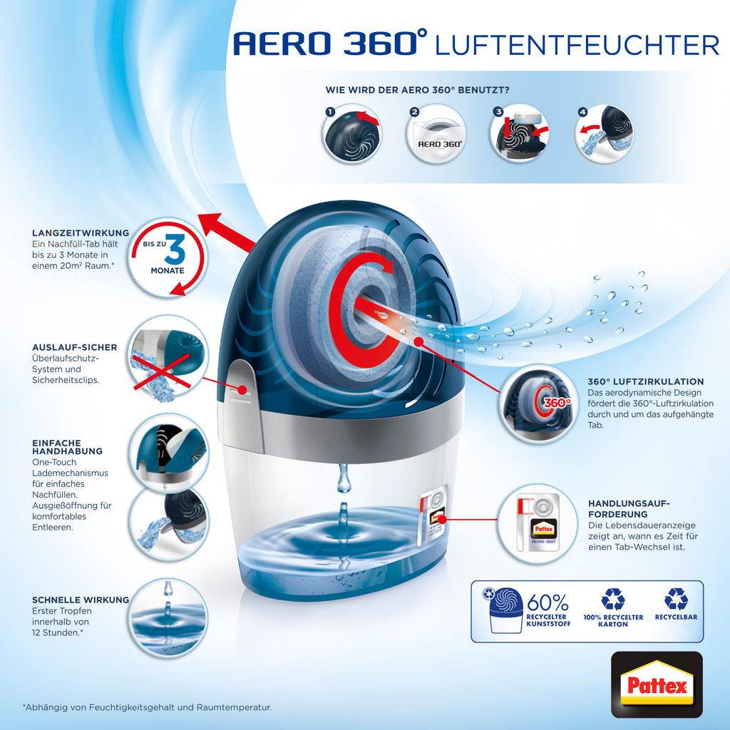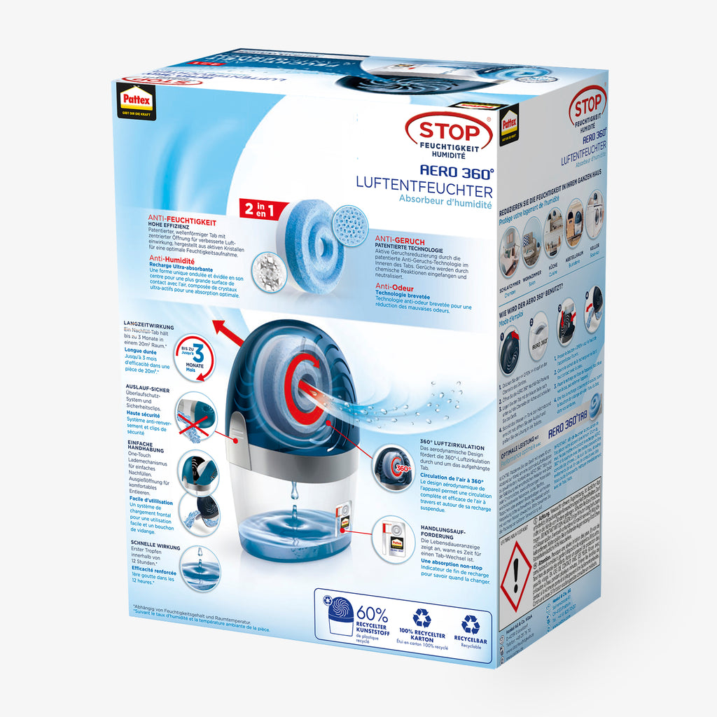 Der Luftentfeuchter mit AERO 360° Technologie von Pattex ist eine praktische und leise Lösung, um Feuchtigkeit in Innenräumen effektiv zu reduzieren. Dank der innovativen 360°-Luftzirkulation nimmt das Gerät Feuchtigkeit gleichmässig aus der Raumluft auf und sorgt so für ein angenehm trockenes und frisches Raumklima. Gleichzeitig hilft es, der Bildung von Kondenswasser, Schimmel und unangenehmen Gerüchen vorzubeugen – ganz ohne Strom oder Batterien.