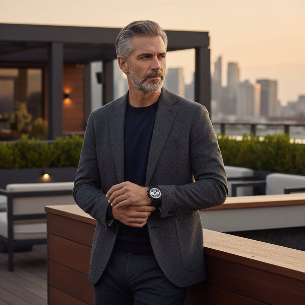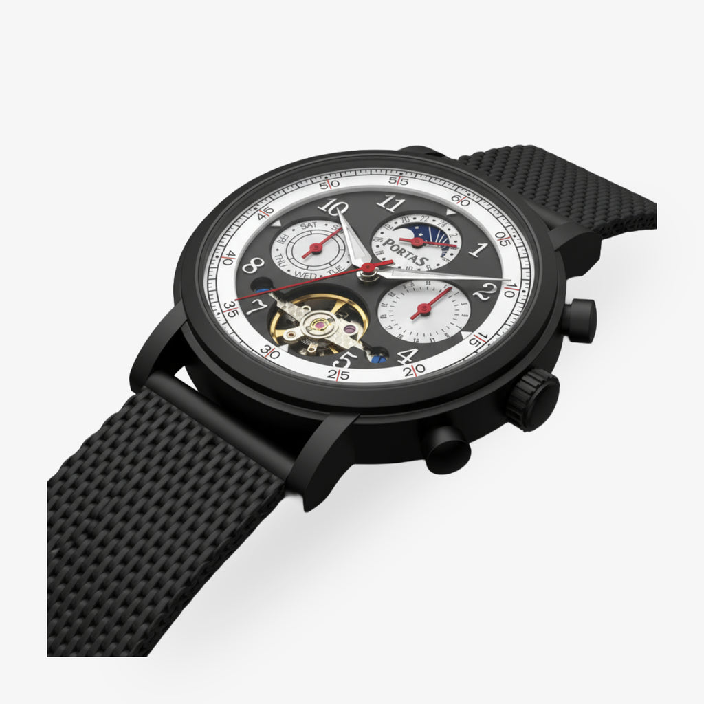 Die PortaS Automatikuhr «Hommage 1770» Black & White Edition kombiniert markantes Design mit hochwertiger Technik. Ihr IP-Black-beschichtetes Edelstahlgehäuse strahlt dezente Stärke und Raffinesse aus. Das gewölbte Mineralglas verleiht Tiefe und hebt die Details des zweifarbigen Zifferblatts hervor.