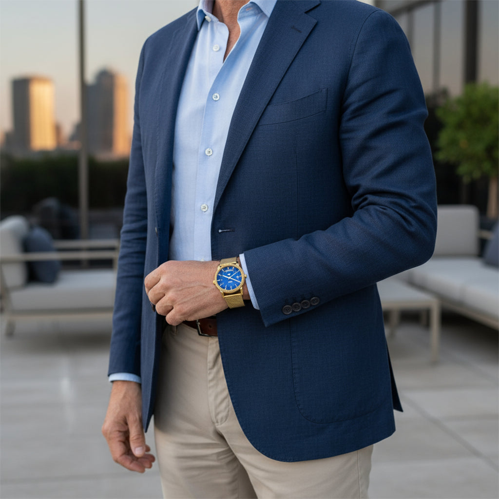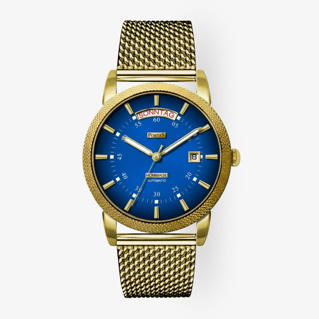 Die PortaS Automatikuhr «Hommage 1770» in Blau steht für handwerkliche Präzision und raffiniertes Design. Das Zifferblatt in intensivem Blau mit feinem Farbverlauf und edlem Sunburst-Schliff sorgt für Tiefe und Leuchtkraft.