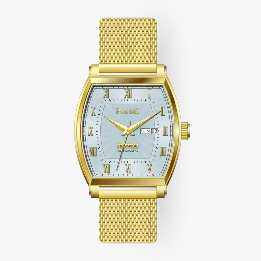 Die PortaS Automatikuhr «Hommage 1770» Ice Blue ist ein Meisterstück klassischer Uhrmacherkunst. Ihr Tonneau-Gehäuse aus poliertem IPG-Edelstahl sorgt für einen ausdrucksstarken, raffinierten Look. Das robuste Mineralglas schützt das sorgfältig gestaltete Zifferblatt, während das japanische Automatikwerk Miyota 8205 für höchste Zuverlässigkeit steht.
