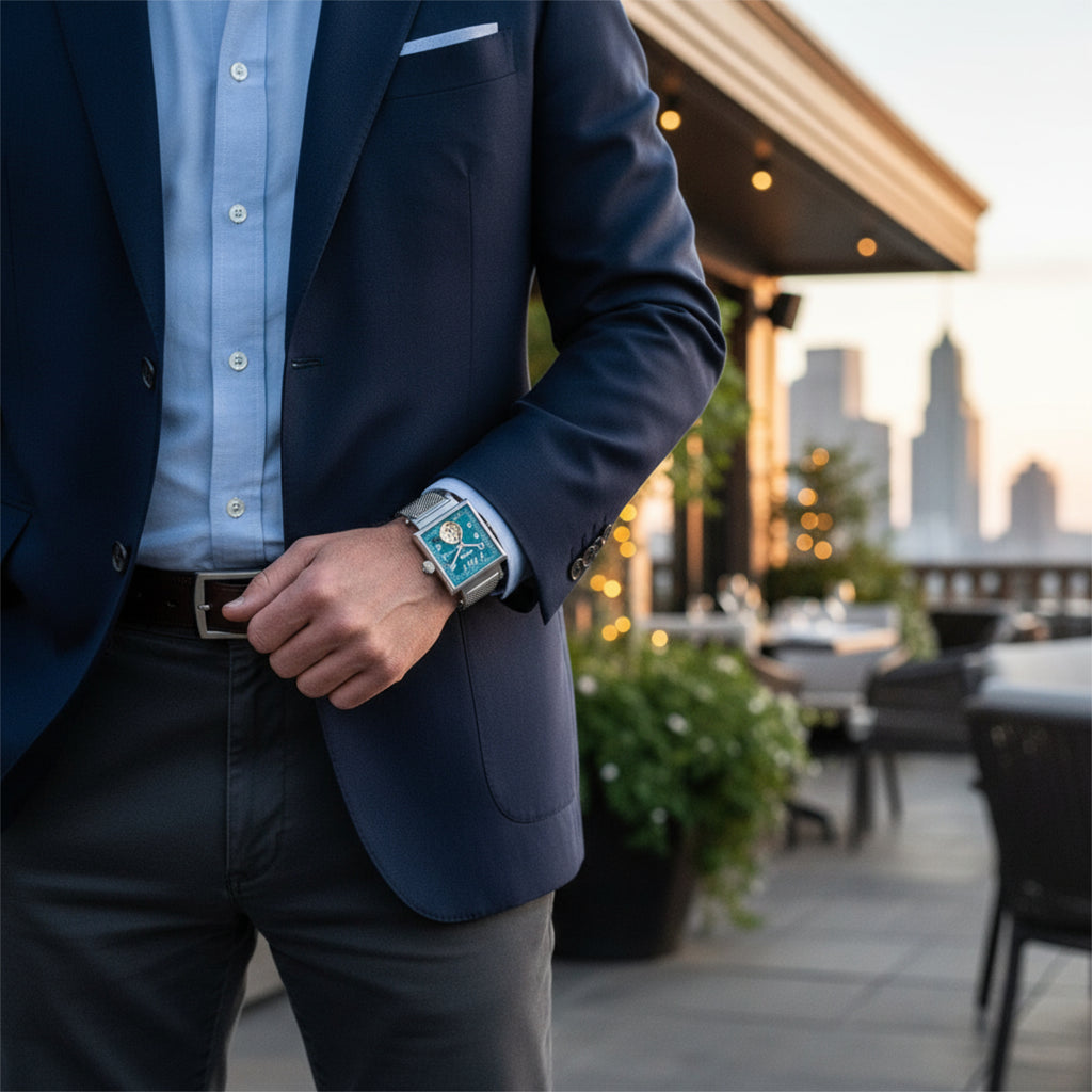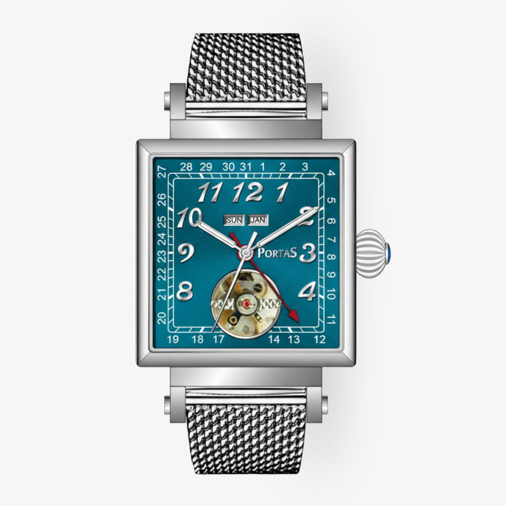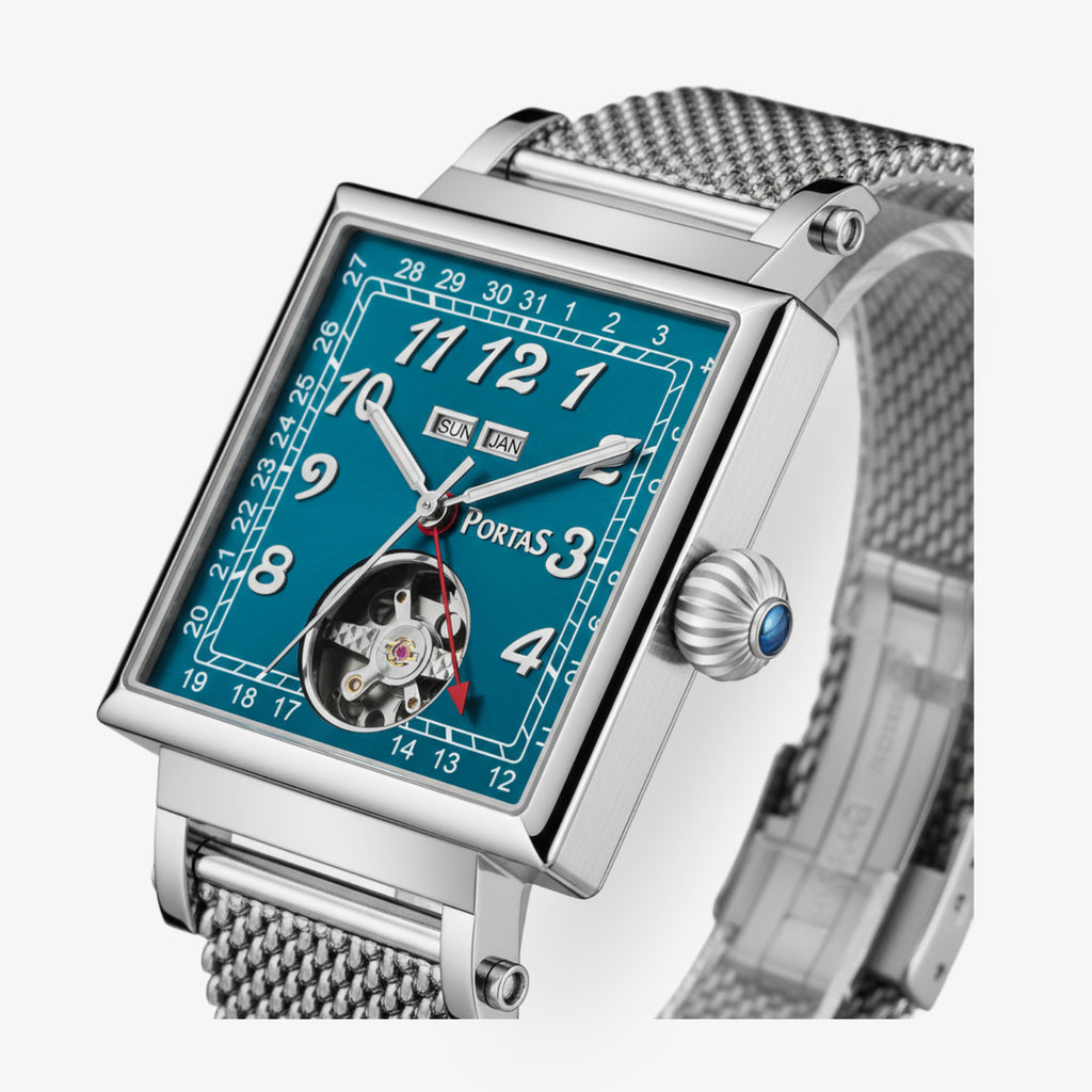 Die PortaS «Hommage 1770» ist eine Hommage an klassische Uhrmacherkunst mit moderner Formensprache. Das eckige Edelstahlgehäuse verleiht der Uhr eine maskuline Präsenz, während das petrolfarbene Sunburst-Zifferblatt für einen faszinierenden Lichtspiel-Effekt sorgt.