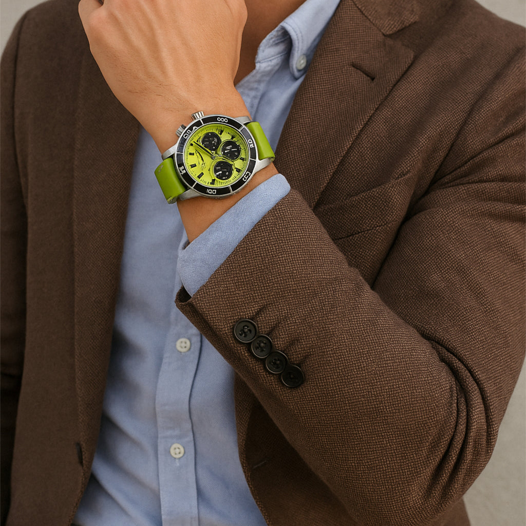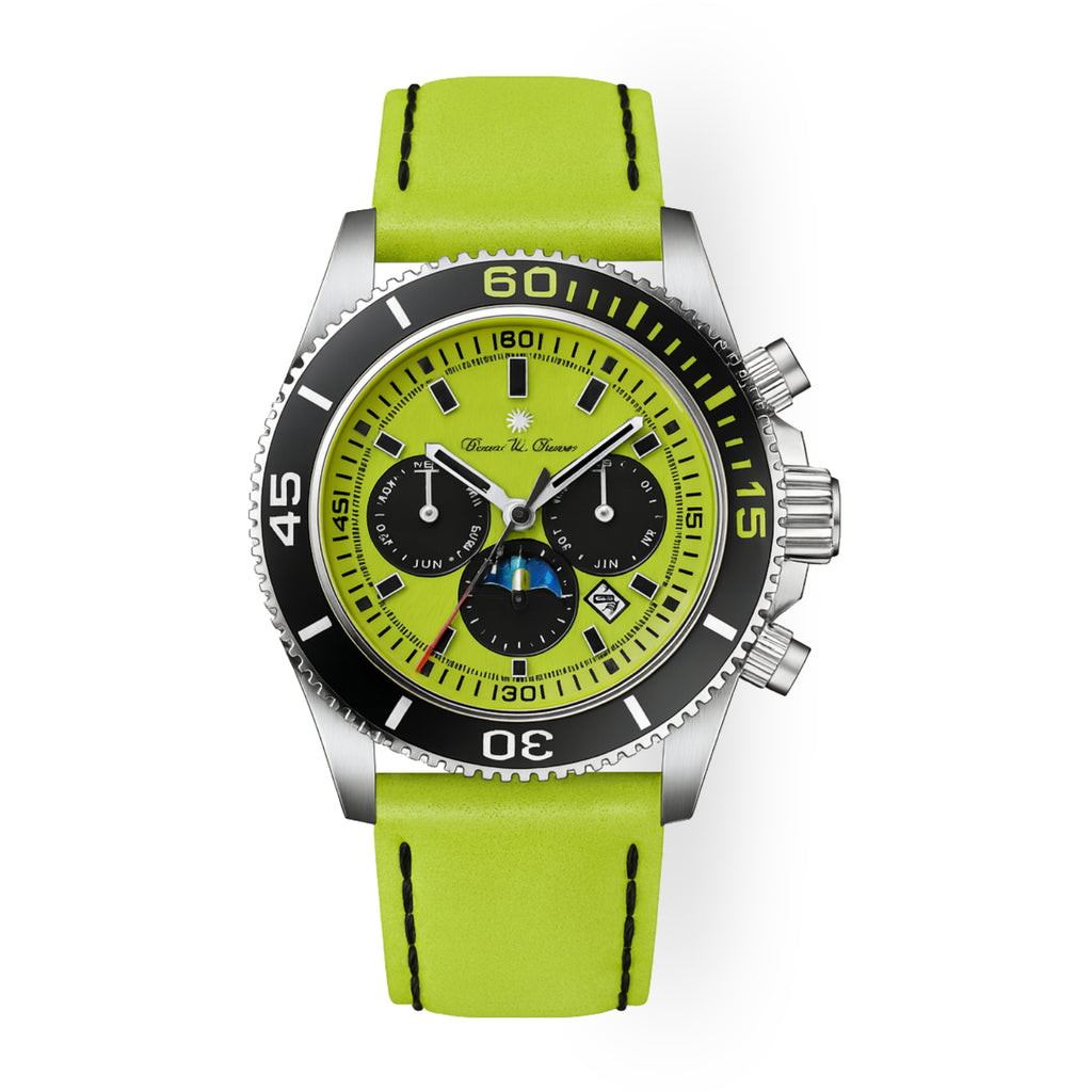 Sportlich-elegante Automatikarmbanduhr mit auffälligem limettengrünem Design, vielseitigen Kalenderfunktionen und robustem Edelstahlgehäuse mit kannelierter Drehlünette.