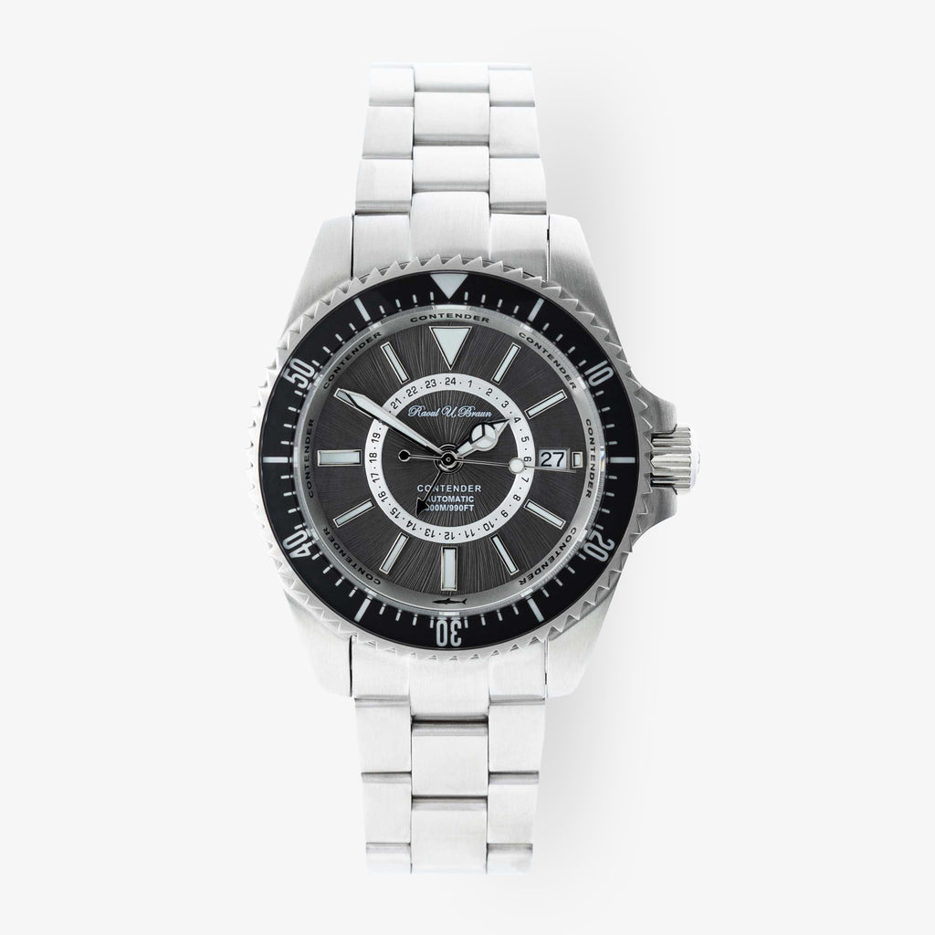 Das runde Edelstahlgehäuse, 42 × 14 mm, ist robust gefertigt und mit Saphirglas sowie einem verschraubten Glasboden ausgestattet, der einen Blick auf das präzise Uhrwerk erlaubt. Das graue Zifferblatt mit Contender-Schliff verleiht der Uhr eine moderne, maskuline Note, während die silberfarbenen fluoreszierenden Zeiger und Indexe beste Ablesbarkeit gewährleisten.