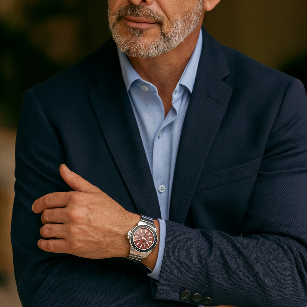 Das Automatikwerk TMI NH34 mit 24 Lagersteinen sorgt für höchste Zuverlässigkeit und Präzision. Neben einem Vollkalender bietet sie eine 24-Stunden-Anzeige, Tag/Nacht-Funktion sowie eine GMT-Funktion – perfekt für alle, die auf Reisen oder im Geschäftsleben mehrere Zeitzonen im Blick behalten möchten.