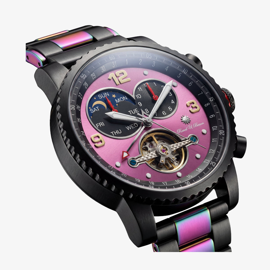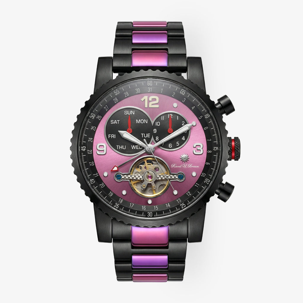 Die Raoul U. Braun Automatikuhr RUB05-0051-RABK-pu-s ist eine kompromisslose Designuhr mit mechanischem Anspruch. Das grosszügige 47-mm-Gehäuse aus Edelstahl ist aufwendig bicolor beschichtet – IP Black/Rainbow – und sorgt für eine markante Präsenz am Handgelenk.